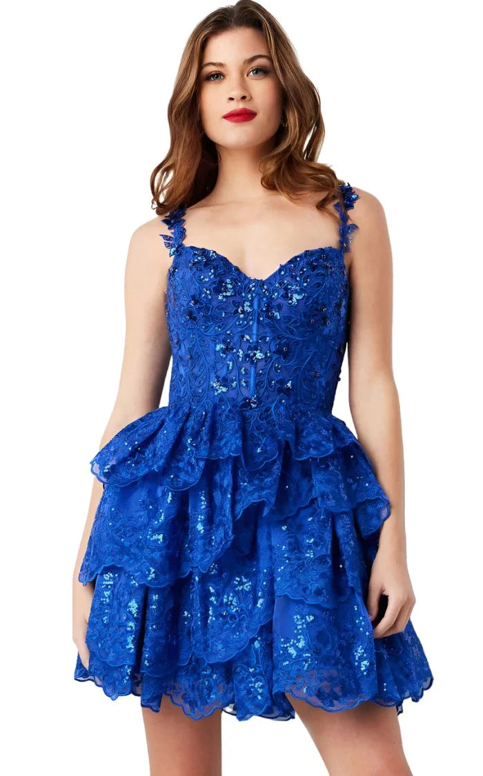 Upgrade your homecoming style with the Jovani 37080 Short Lace Ruffle Dress. The sequin embellished lace corset and asymmetrical layered short skirt create a chic silhouette, perfect for a night out. Stand out in this elegant and trendy cocktail dress. This Cocktail Dress is perfect for any formal occasion!