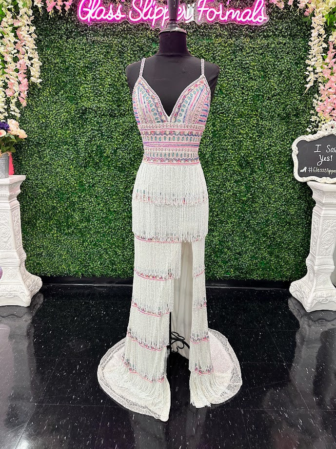 The dress showcases a fringe and beaded skirt that includes a high slit, offering a touch of allure and allowing for graceful movement. The sweeping train adds a dramatic and elegant element to the overall design. The beaded bodice contributes to the dress's glamour, providing a sparkling and eye-catching focal point.