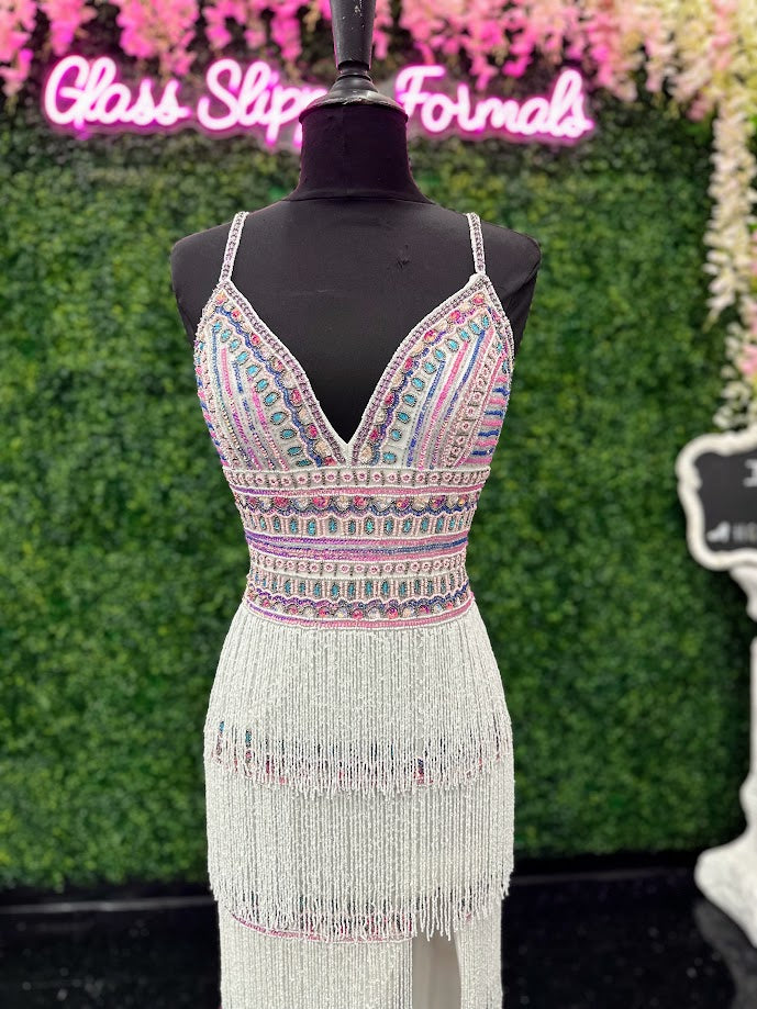 Make a statement in Jovani’s 38846 prom dress, crafted with sequin-beaded fringe detailing and a fitted tulle silhouette. The style features a beaded bodice and spaghetti strap V neckline, plus a dramatic open tie-back and sweeping train. The skirt showcases a high slit and beaded fringe design, completing the look.