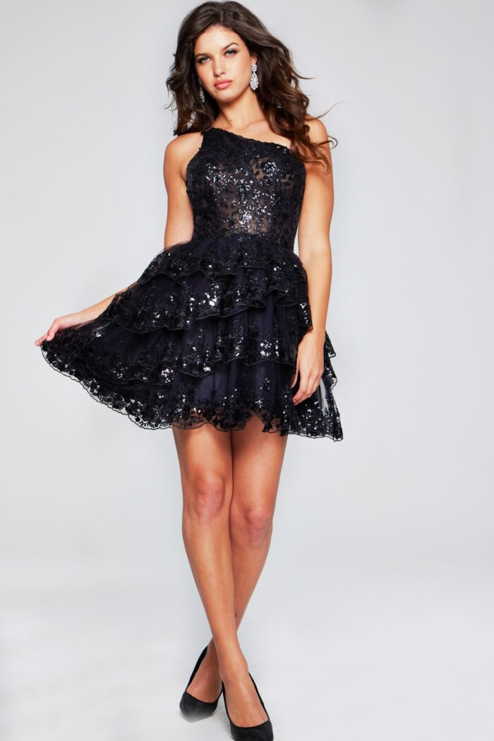 The Jovani 42016 Short Sheer Sequin Homecoming Dress is the epitome of elegance. Featuring delicate lace, a one shoulder design, and a flattering A-line silhouette, this dress will make you stand out. The sheer sequin detailing adds a touch of sparkle, perfect for any special occasion.