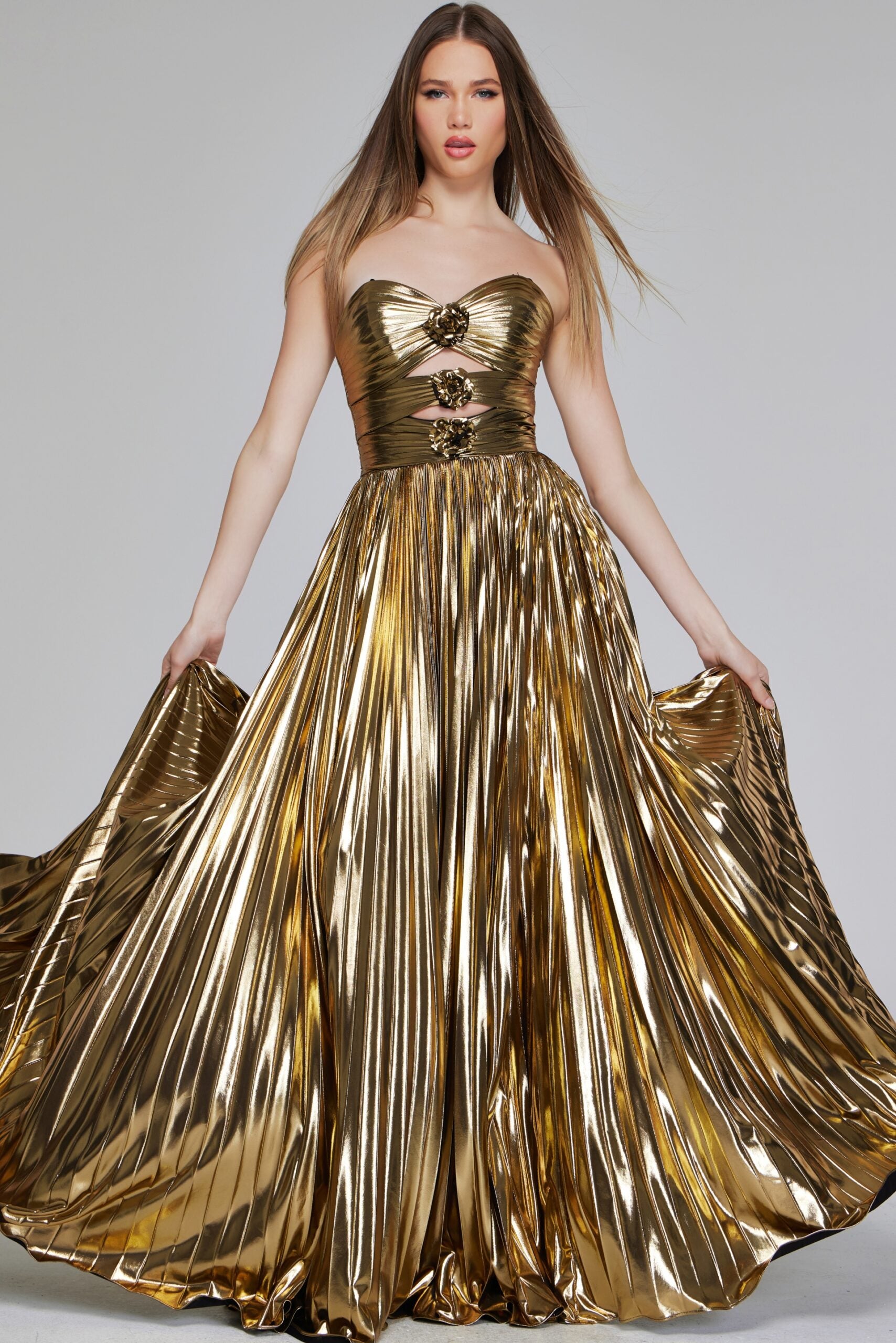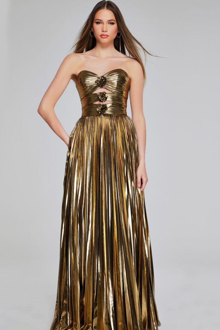 Jovani 42335 Pleated Metallic Strapless Dress Formal Cut Out Evening Gown Prom Flowers