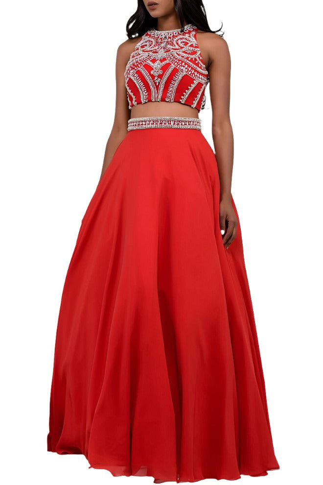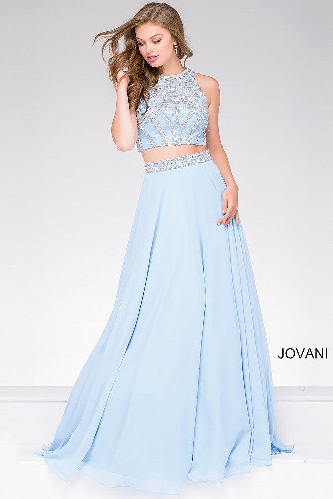 Jovani 47848 two piece long prom gown with sleeveless high neckline crystal top that has a cutout back and full ballgown bottom has a crystal beltline and chiffon overlay.
