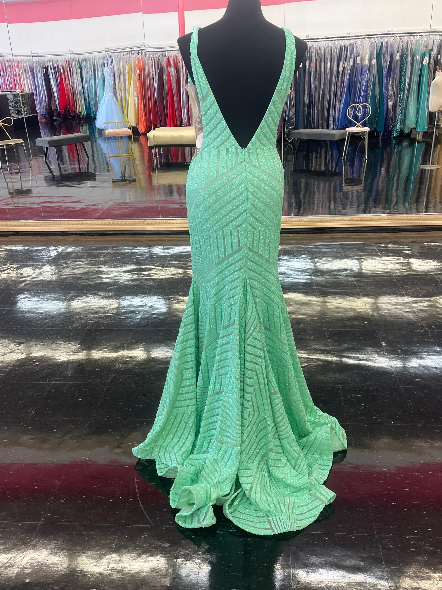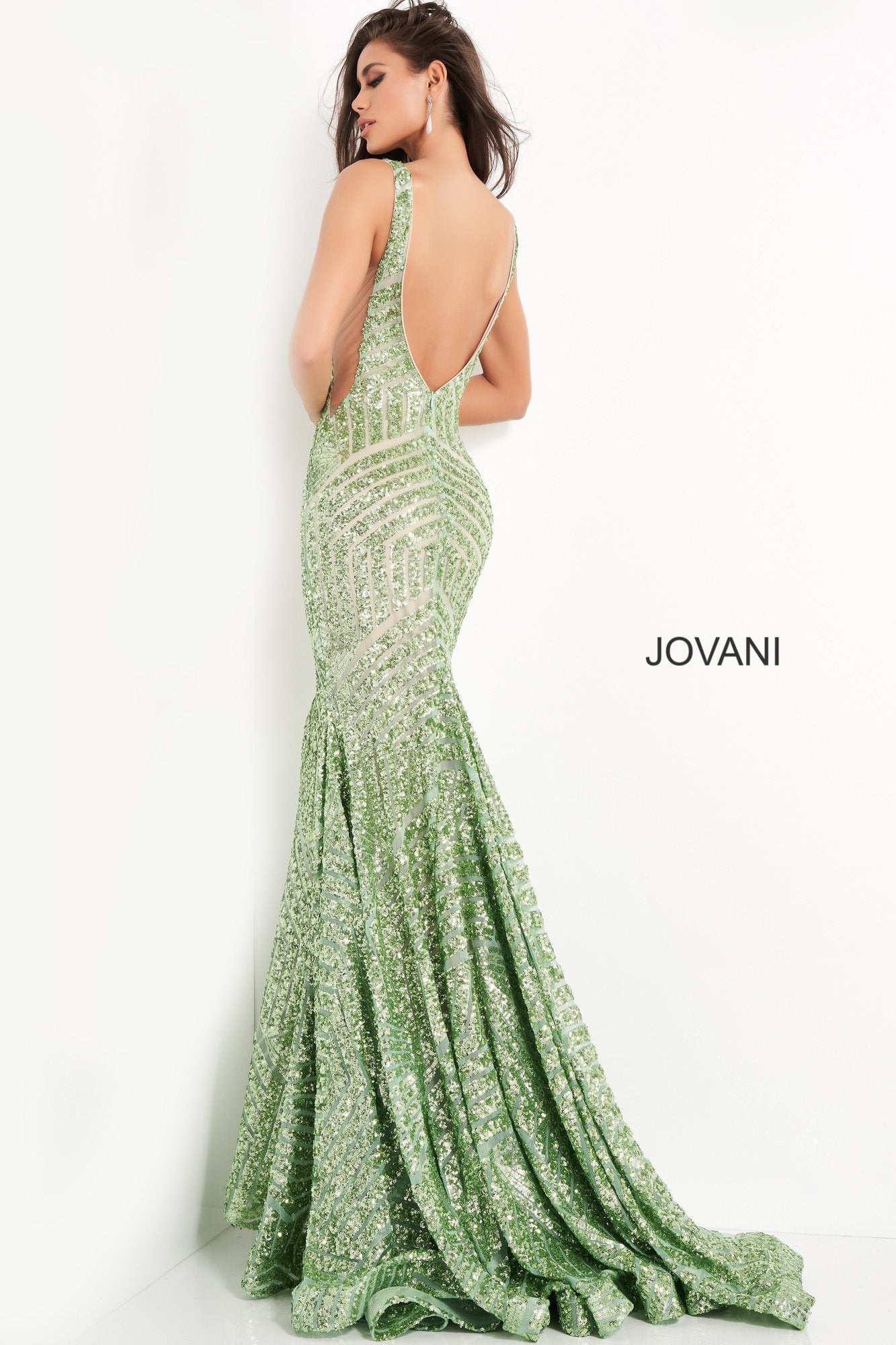 Long Jovani 59762 Mint Green Prom Dress, Featuring a plunging neckline & A Fully sequined Fitted Mermaid Bodice. This Open V Back Pageant Gown & prom dress is perfect for the stage is has a lush trumpet sequin embellished skirt and sweeping train.