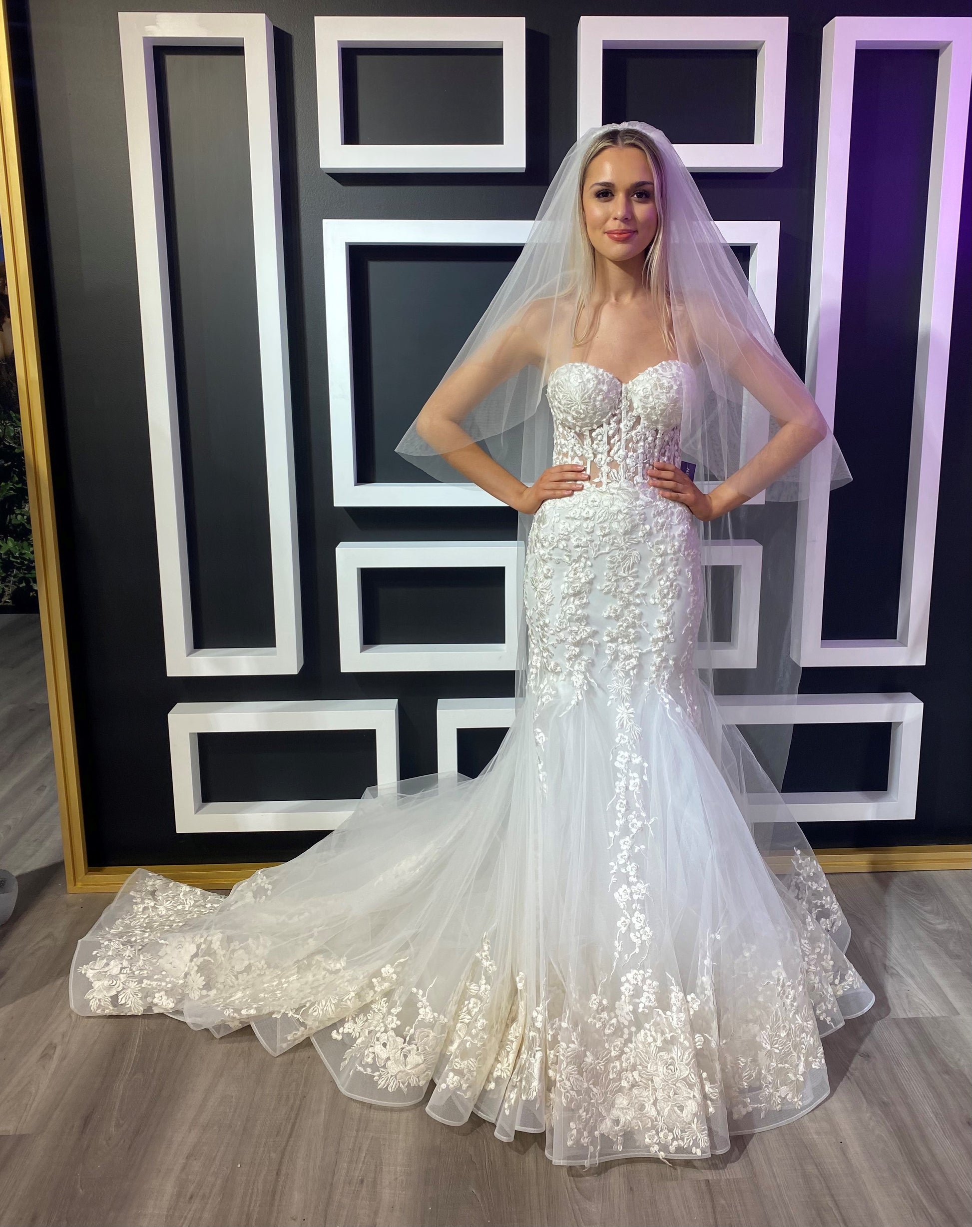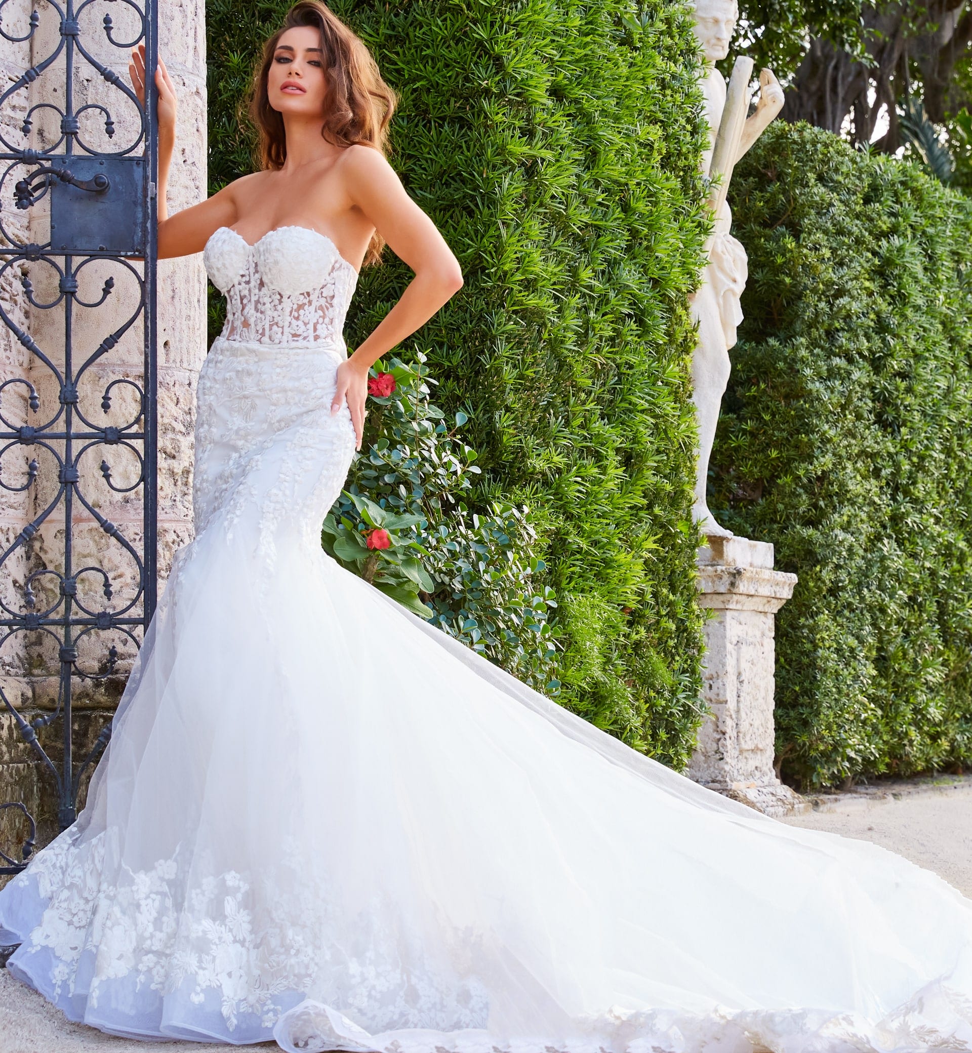 This Jovani JB07260 off white wedding dress is styled in soft tulle with floral appliques, featuring a sheer corset bodice with a strapless sweetheart neckline. Lush godets form this trumpet-style bridal gown, finished with a lace border hemline and a semi-cathedral train.