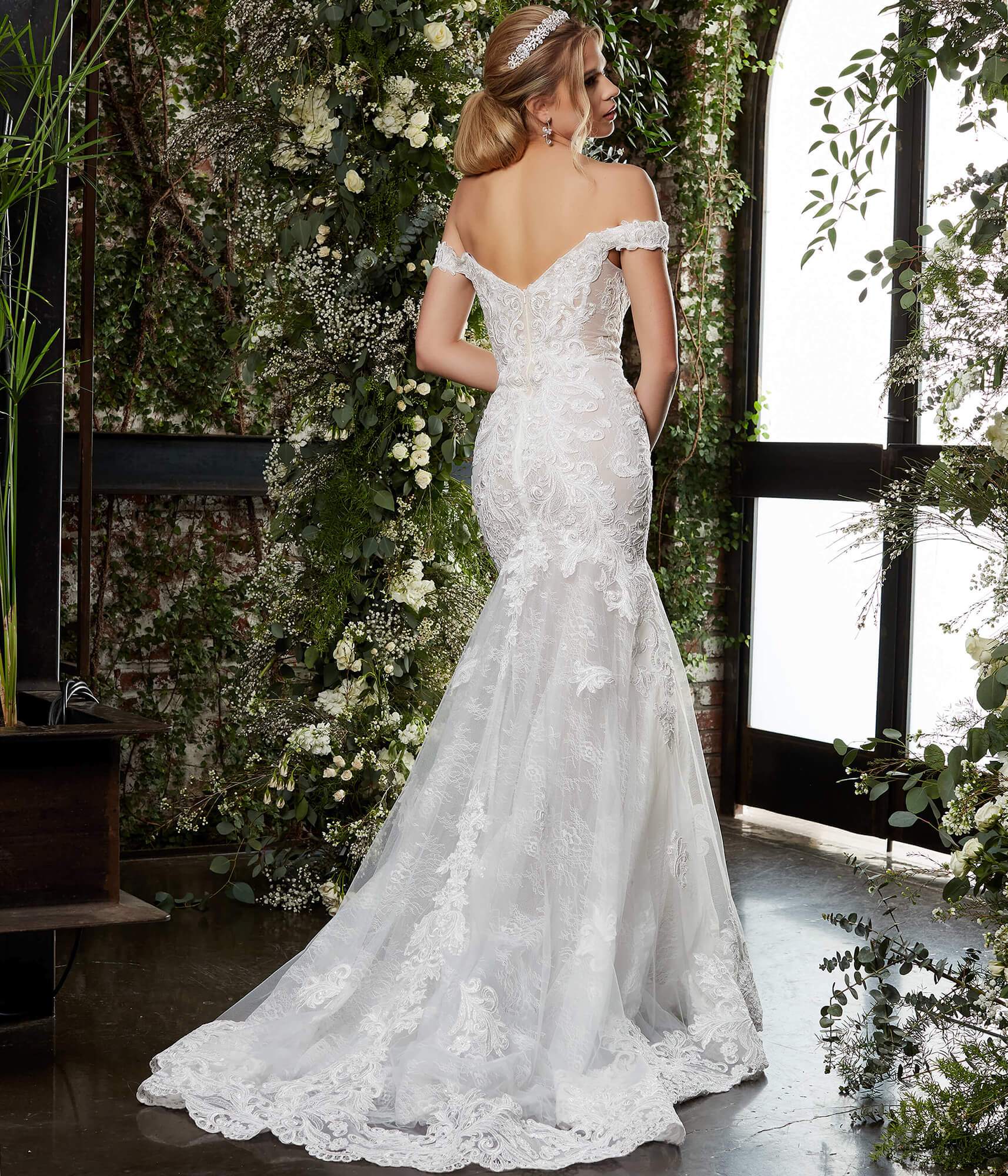 Jovani Bridal JB07266A Long Sheer Lace V Neckline Mermaid Wedding Dress off the shoulder sleeves. lush lace train