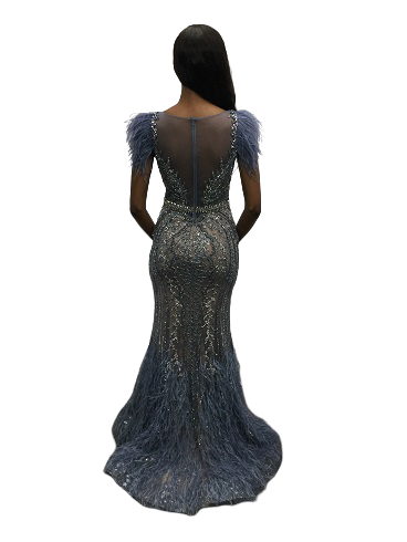 Jovani Couture 02326 is a long fitted Formal Evening Gown Great For Pageants, Red Carpet Events, Event Guests & More! Fit & Flare Mermaid silhouette with a sheer Illusion high neckline with a plunging effect with mesh trimmed in Embellishments that cascade into the bodice. Hand Beaded with sequin, liquid beading, Beaded Fringe tassels & rhinestones. Vintage blue embellished evening dress with a sheer illusion boat neckline, feather trim cap sleeves, beaded waist belt and closed sheer back. Floor-length fitted skirt with a flared end and feather trim detailing. Elaborate ostrich feather trumpet skirt with sweeping train. glitter accented