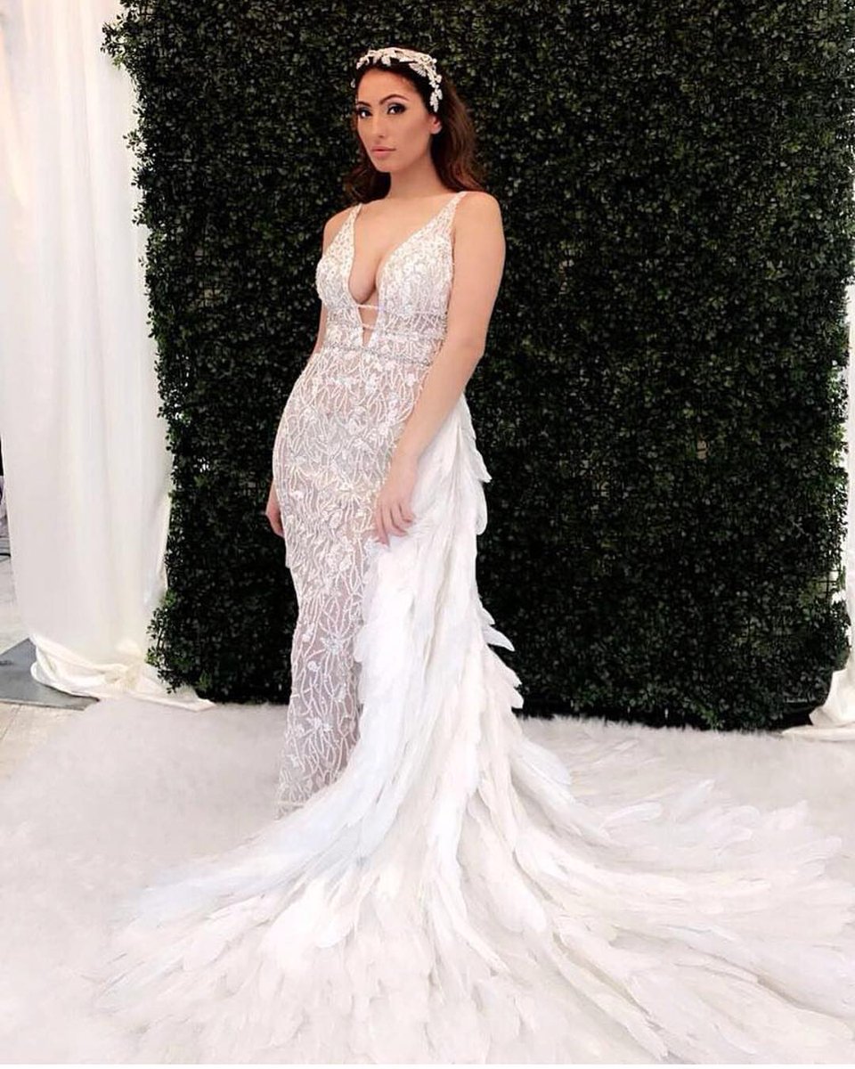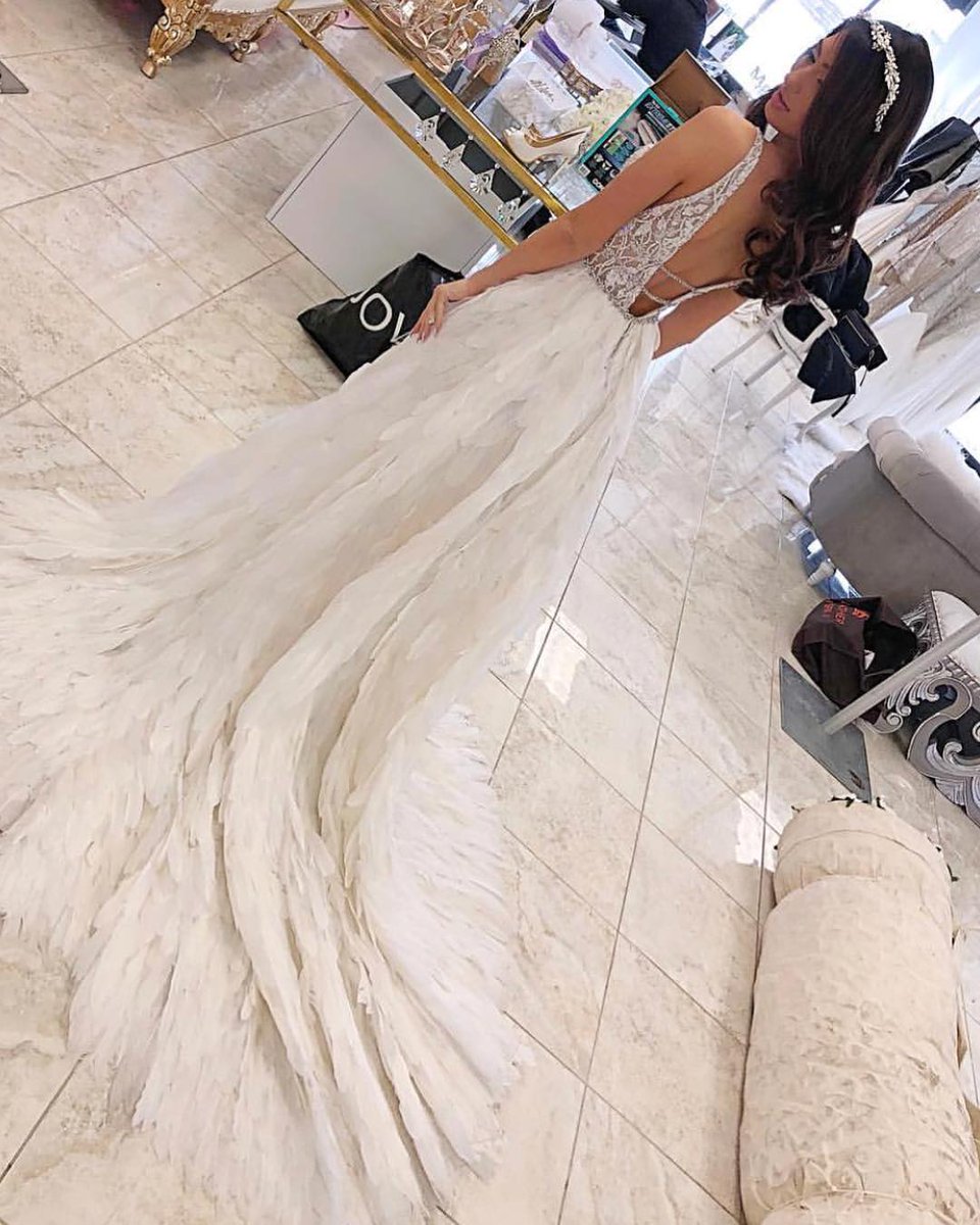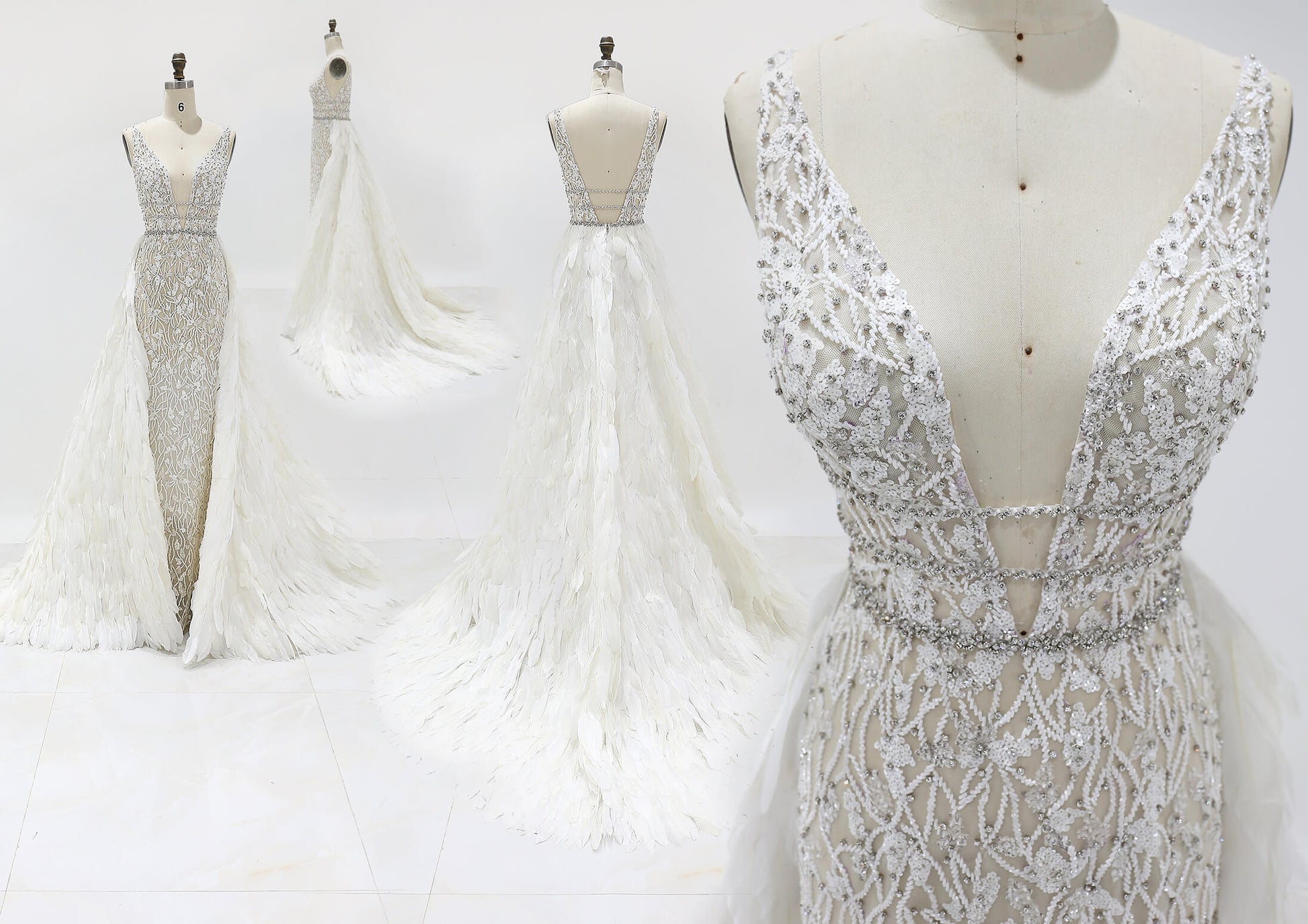 Jovani Couture S62942 is a Truly Magical Gown! This Long Fitted Pageant Dress Features Hand Beaded sequins, liquid beading, crystal rhinestones elaborately placed in a slight floral damask design cascading along the fitted wedding dress. The Show Stopping Lush Feather Overskirt features a gorgeous sweeping train and wraps along the sides. Perfect Over skirt Red Carpet Gown or Unique Bridal Gown. Deep Plunging Neckline with an open back. the V necklines features rows of crystal rhinestone belts. When You want to Stand above the crowd this gown is it! 62942
