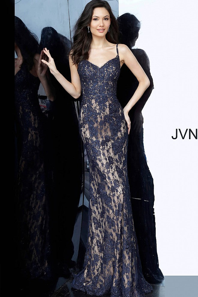 Jovani JVN02013 is a long fitted prom dress with embellished lace. Flared skirt with fitted bodice. eyelash lace along the sweetheart neckline with spaghetti straps. Absolutely stunning evening gown