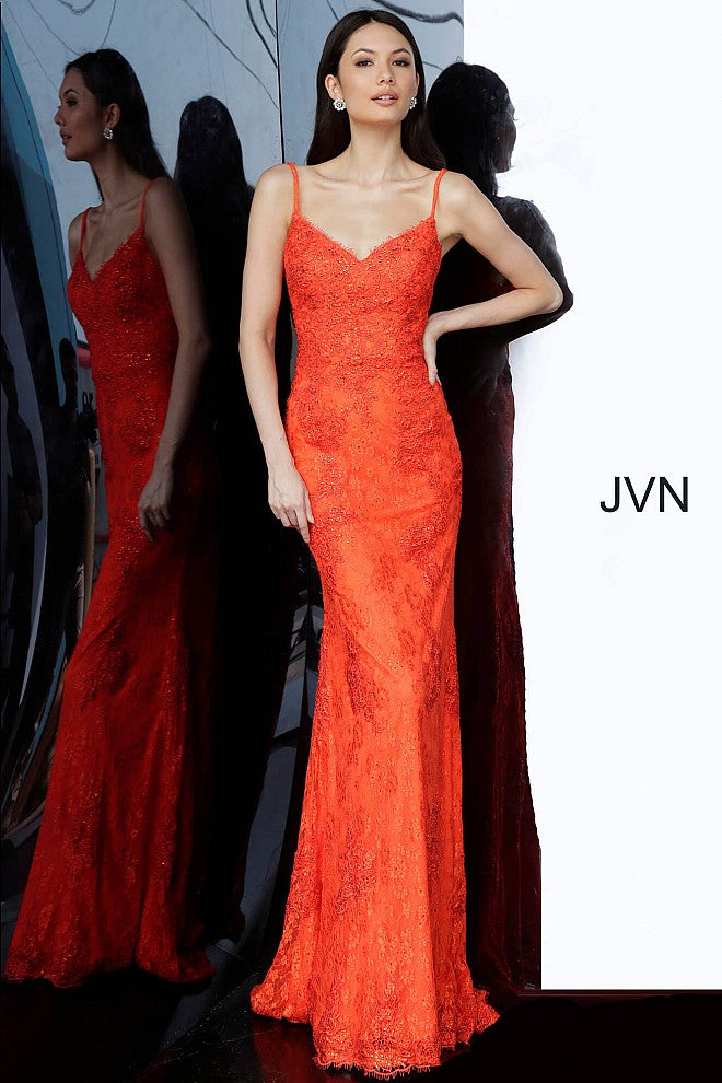 Jovani JVN02013 Size 14 Orange/Red Long Fitted Lace Prom Dress Evening Gown