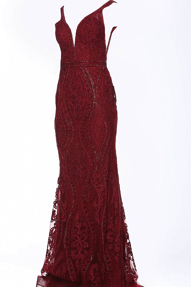 Jovani JVN03112 Size 10 Burgundy Long Fitted Lace Prom Dress Evening Gown V Neck