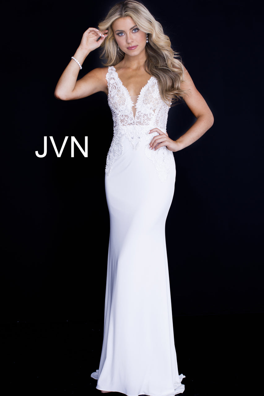 Jovani JVN 50950 - JVN50950 Long fitted formal evening gown. Sheer bodice with embellished lace. great for any event!
