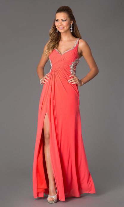 Jovani JVN94375 is a formal evening gown with a v neckline and asymmetrical ruched waistline leading to a slit in the skirt. Fun and flirty style for prom or any formal event!