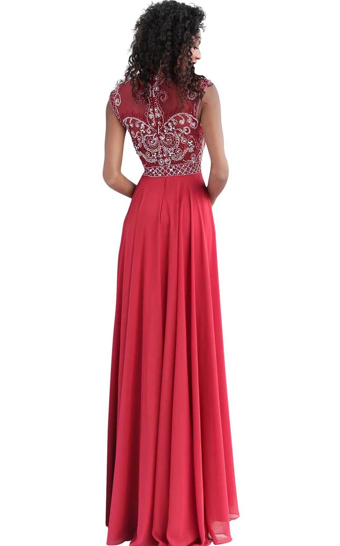 Jovani JVN60451 Size 2 Burgundy Long Beaded A Line Formal Dress Chiffon Sheer High Neckline Gown