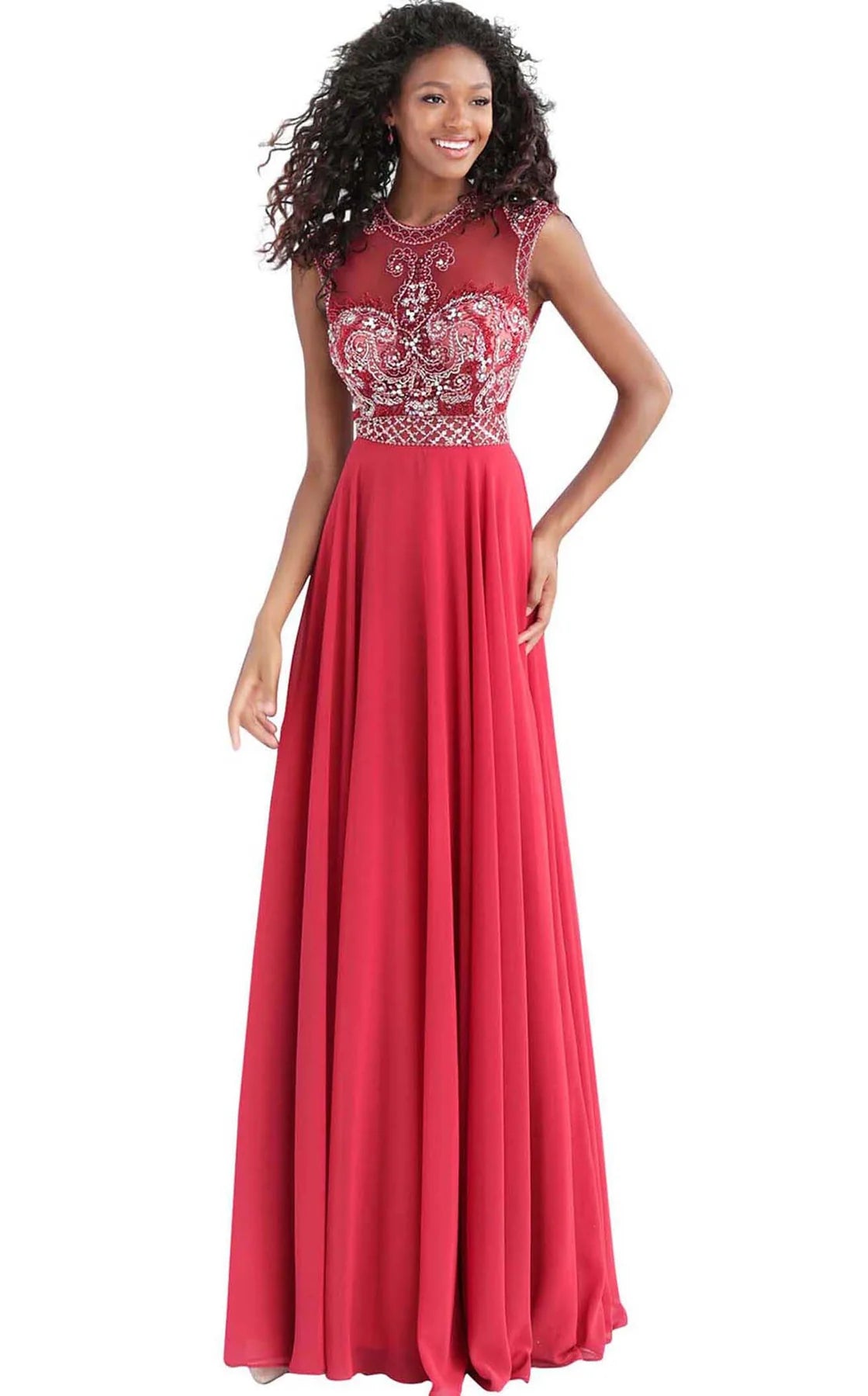 This Jovani JVN60451 gown in size 2 features a sophisticated A-line silhouette crafted from flowing chiffon. Its rich burgundy hue is enhanced by intricate beadwork, adding refined elegance. The sheer high neckline offers a modern touch while maintaining a formal appeal, making this dress an excellent choice for upscale events and special occasions.