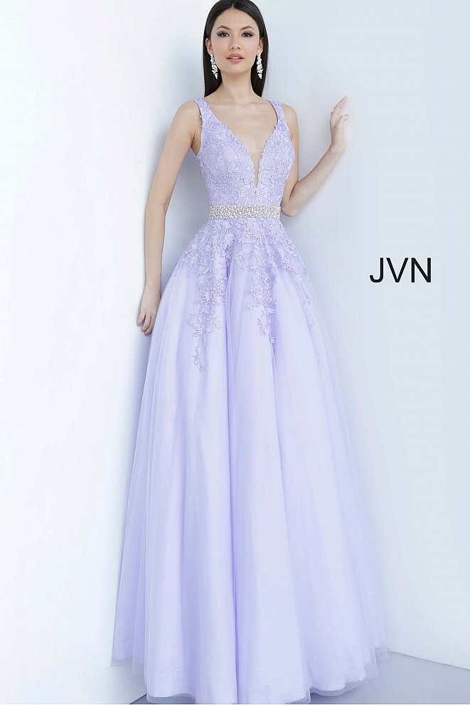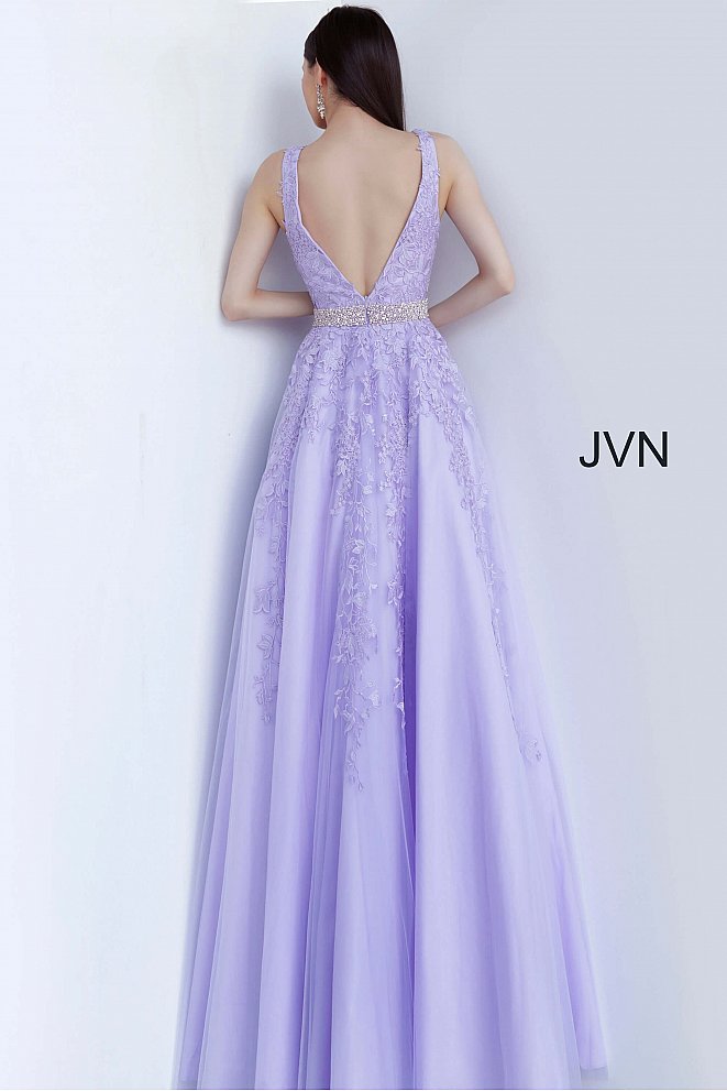 Jovani JVN68258 tulle embellished embroidered A line long prom dress ball gown informal wedding dress evening gown Floral embroidered tulle, embellished belt at waist, A line floor length skirt, fitted sleeveless bodice, plunging neckline with sheer mesh insert, V back.