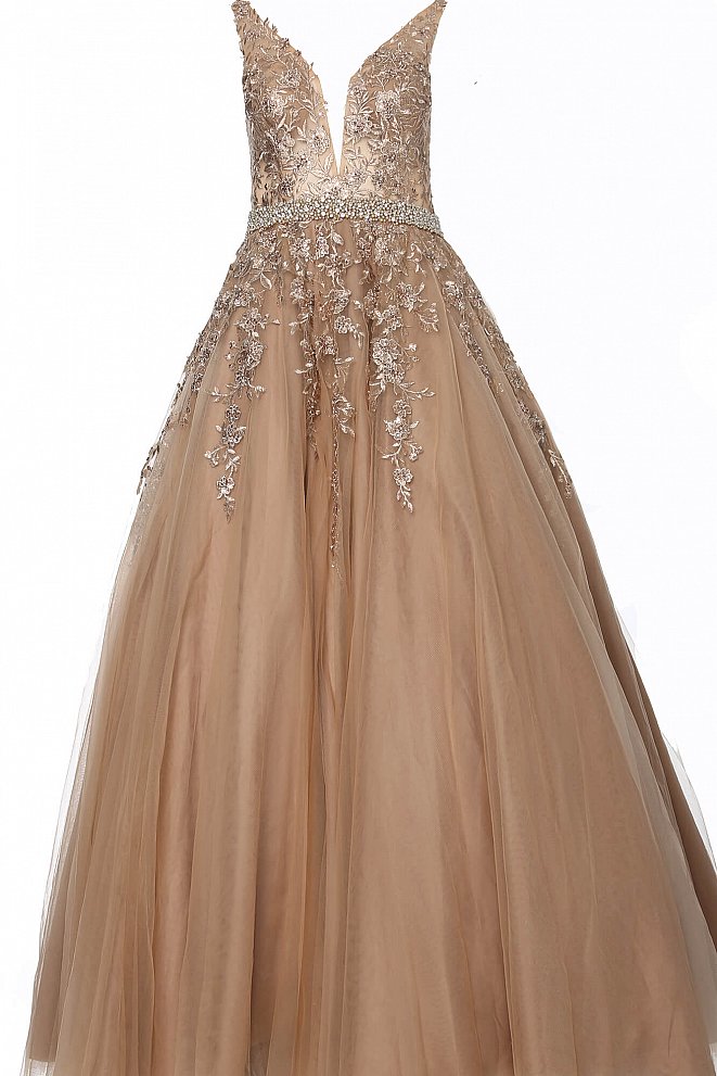 Details: Floral embroidered prom ballgown, crystal-embellished belt at waist, sleeveless bodice, deep V neck, V back.