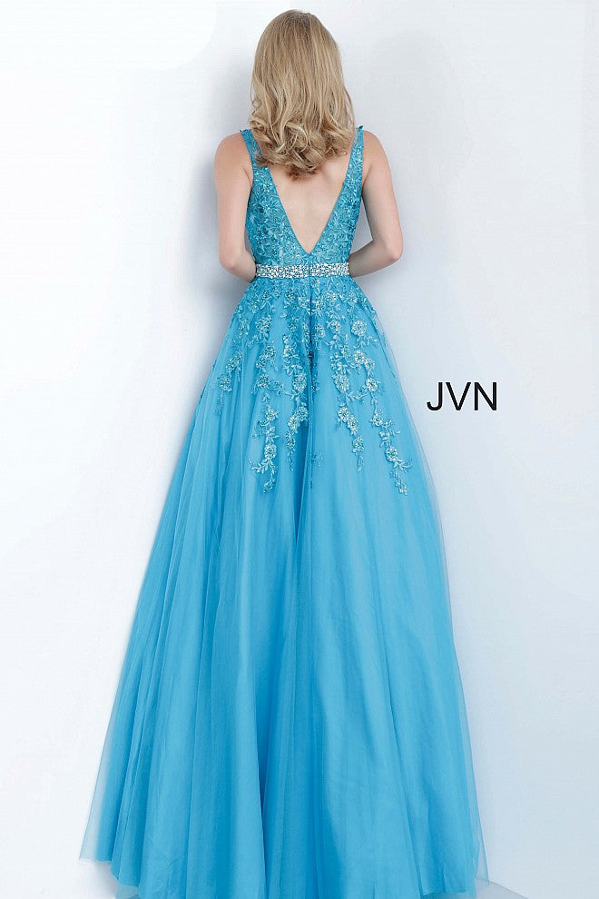 Jovani JVN 00925 is a Stunning Tulle Prom Dress Ballgown with a Plunging neckline And Crystal Waistband. Embellished Lace Bodice & Tulle Skirt with appliques spilling onto the long skirt. Beautiful Evening Gown! JVN00925