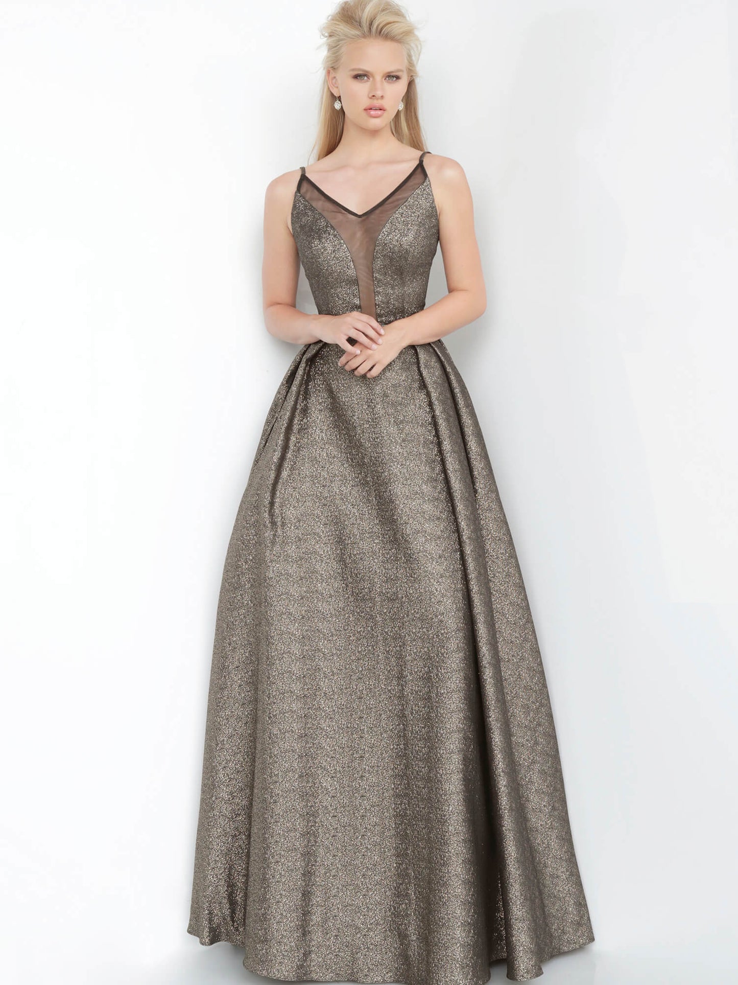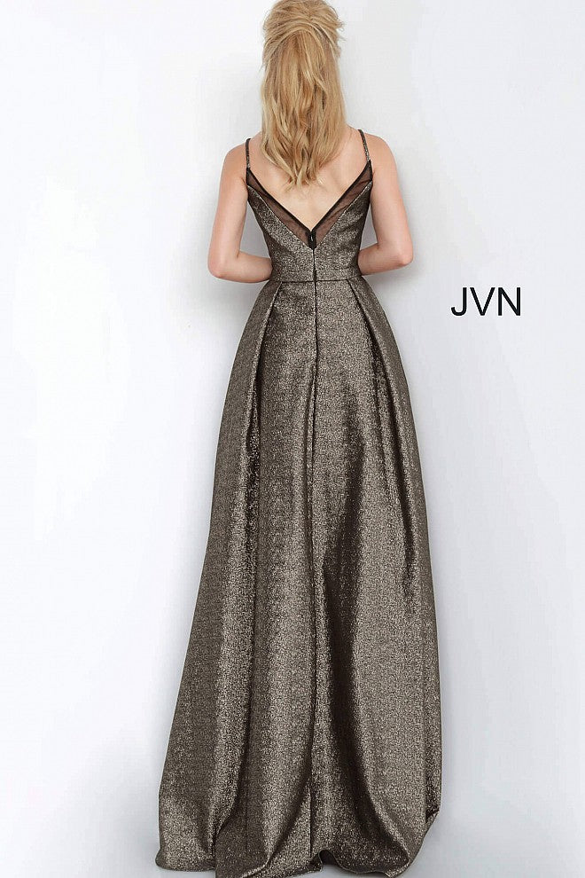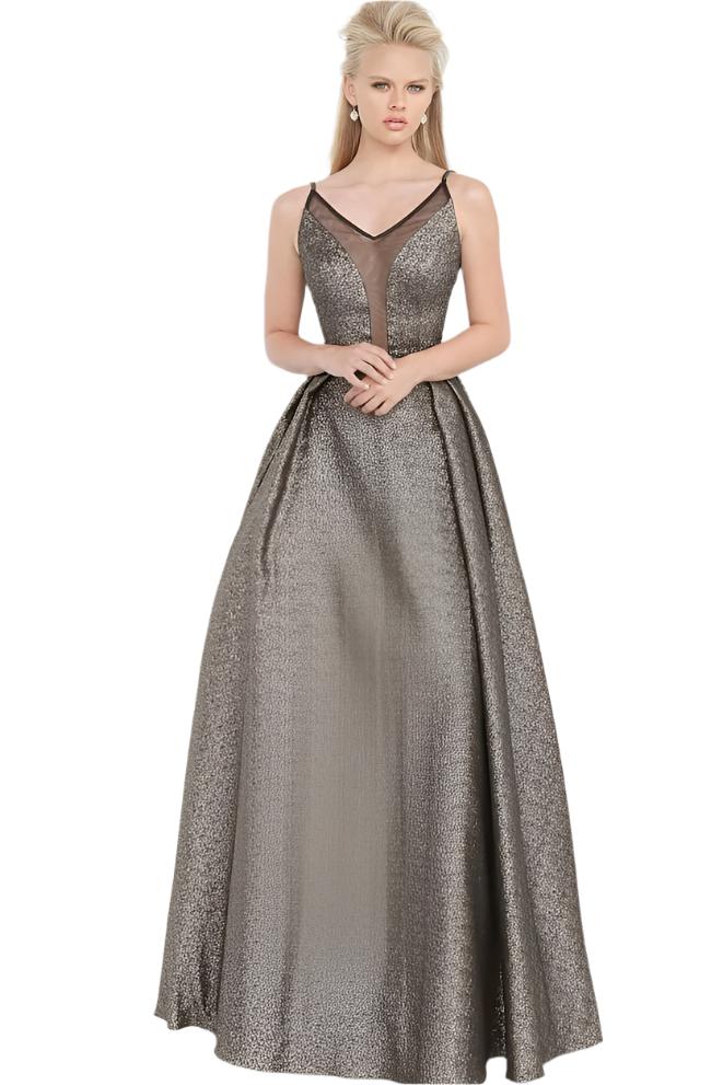 Jovani JVN2549 is a Metallic Shimmer Gold Pleated Ball Gown Prom Dress with a deep plunging neckline with mesh! Sheer illusion plunging neckline. Pockets! JVN 2549 metallic evening gown