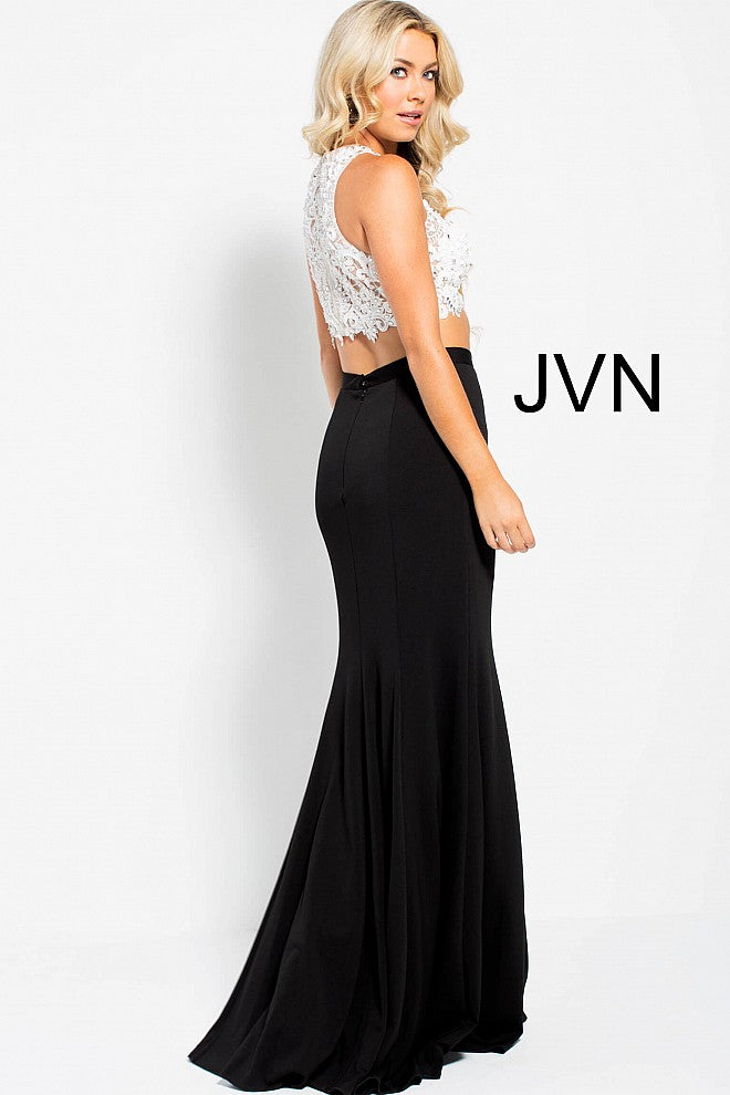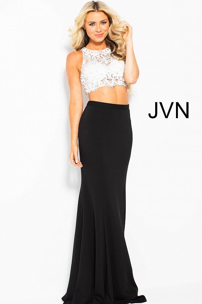 Jovani JVN48701 This is a two piece prom dress with simple slim mermaid jersey bottom and a white lace sleeveless top that is adorned with crystals.