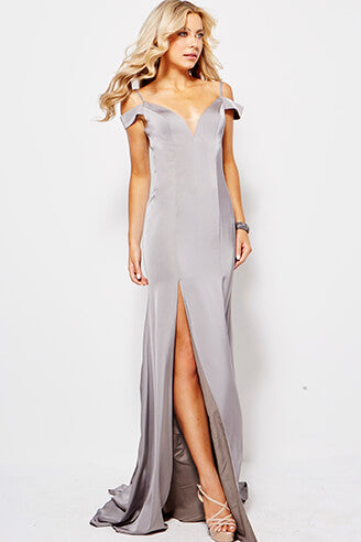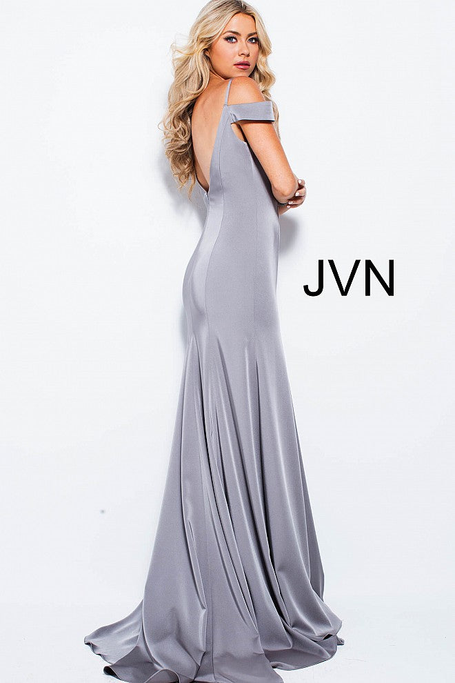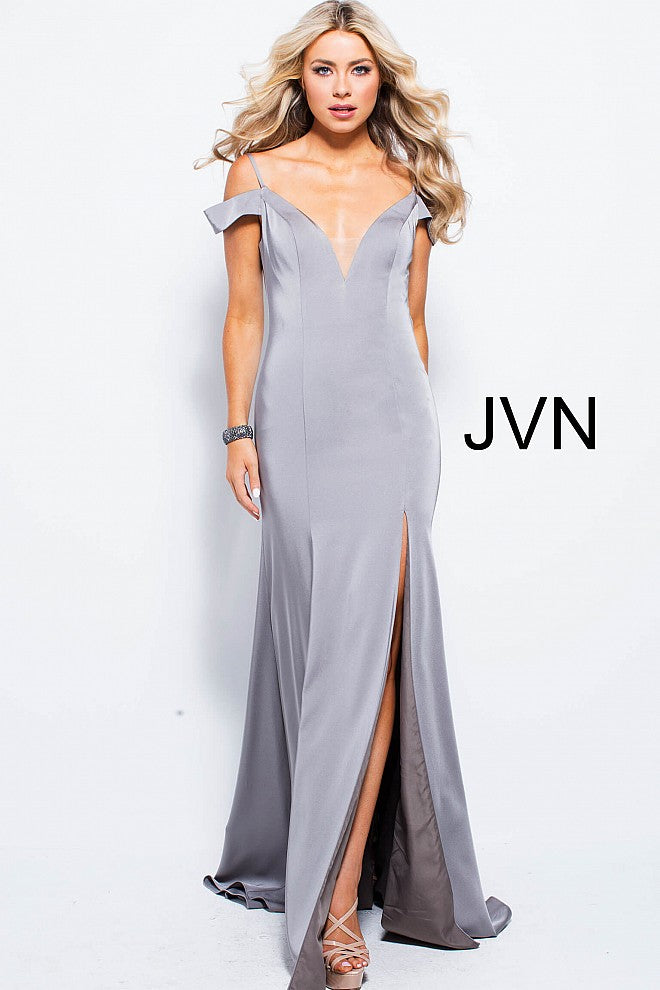 The JVN57297 prom dress from JVN by Jovani features an off the shoulder design and a side slit in a rich Burgundy color. This floor length dress includes a train, form fitting bodice, plunging neckline with a sheer mesh insert, and spaghetti straps over the shoulders. The V back adds an elegant touch to this stunning gown.