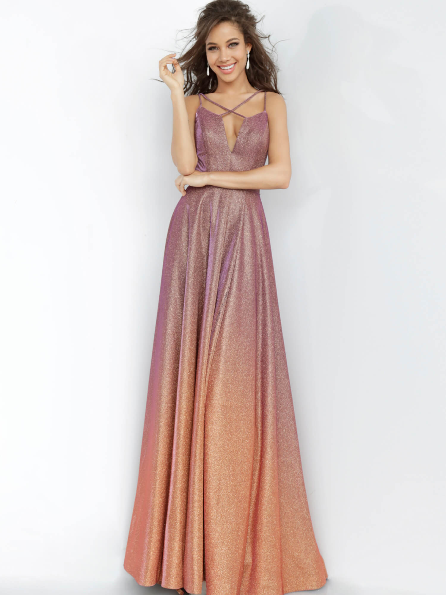 JVN4327 by Jovani is a metallic glitter prom gown with a plunging neckline, Criss Cross Glitter Strap Design with a sleeveless bodice, and cross strap open back, floor-length A-line pleated and flared skirt. Absolute Stunning color combinations with an ombre effect!