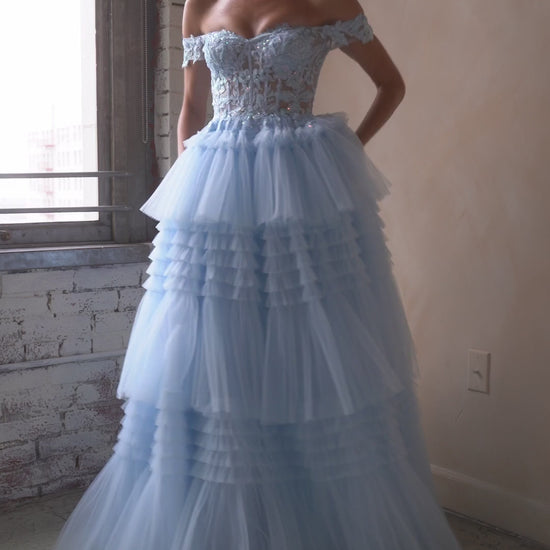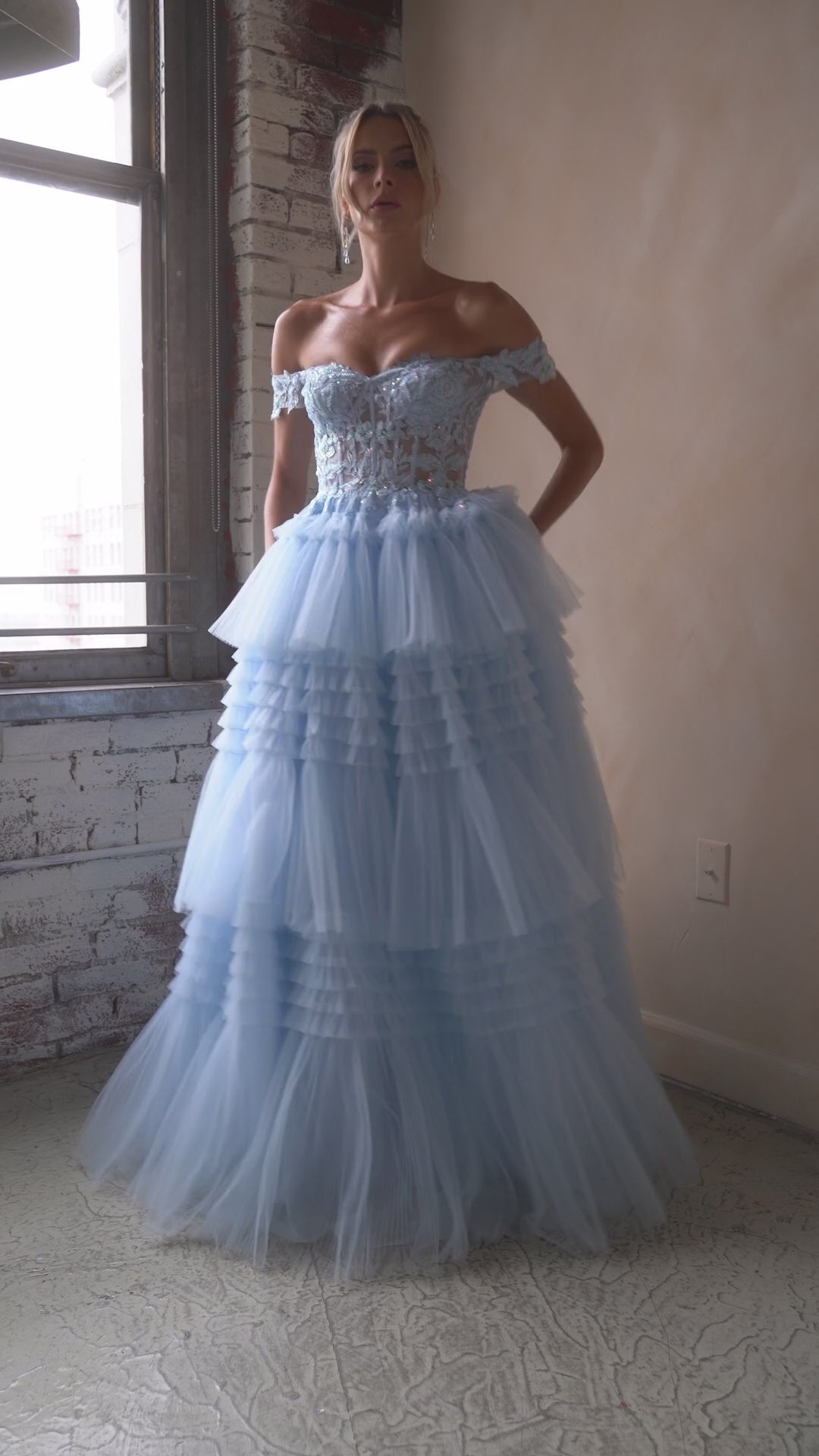 Ladivine 9315 Long Layered Tulle Ballgown Sheer Lace Corset Prom Dress off the shoulder