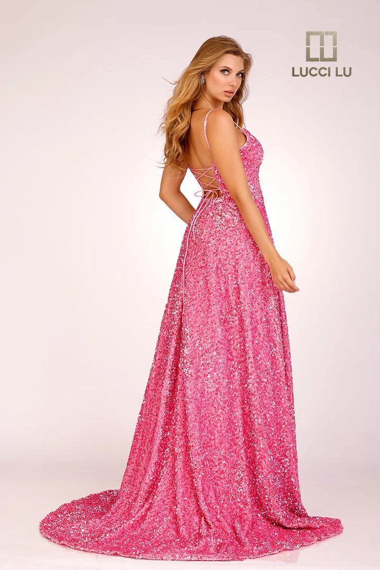 Lucci Lu 1273 Long A Line Velvet Sequin Ball Gown Backless Prom Dress Corset V neck Corset