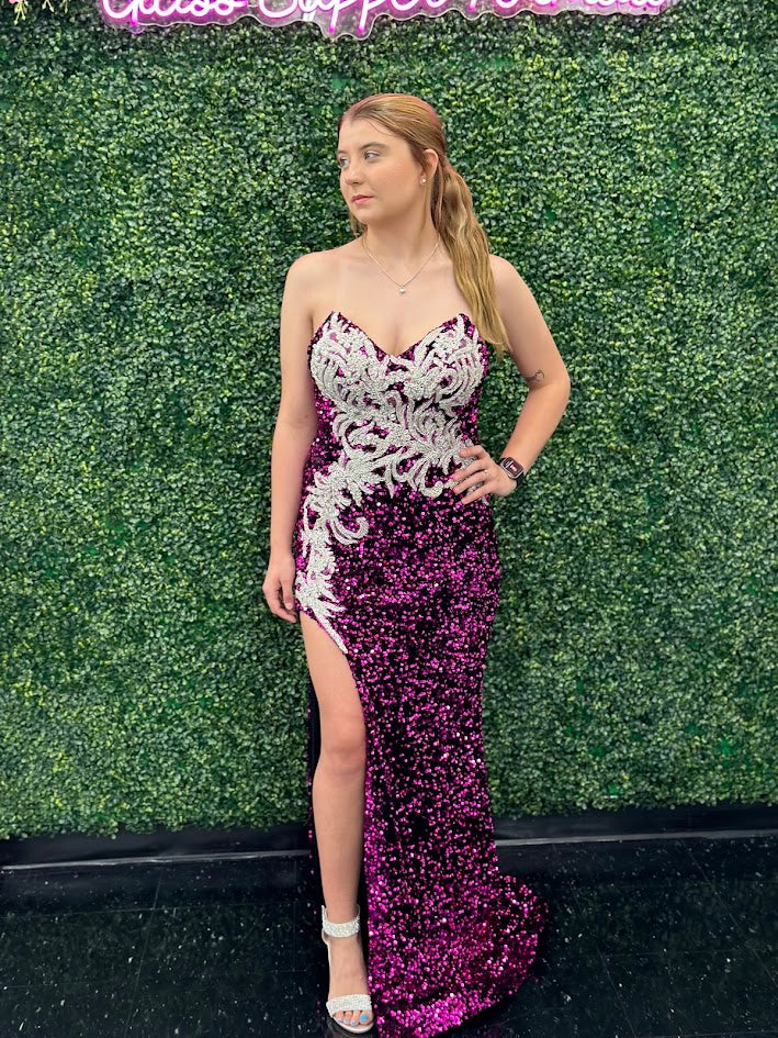 Step into the spotlight with the Lucci Lu 1332 Sequin Velvet Strapless Formal Pageant Dress. This stunning gown features a crystal-embellished bodice and a high slit for added drama. The strapless peak point neckline adds a touch of elegance, making it the perfect choice for your next formal event or prom night.