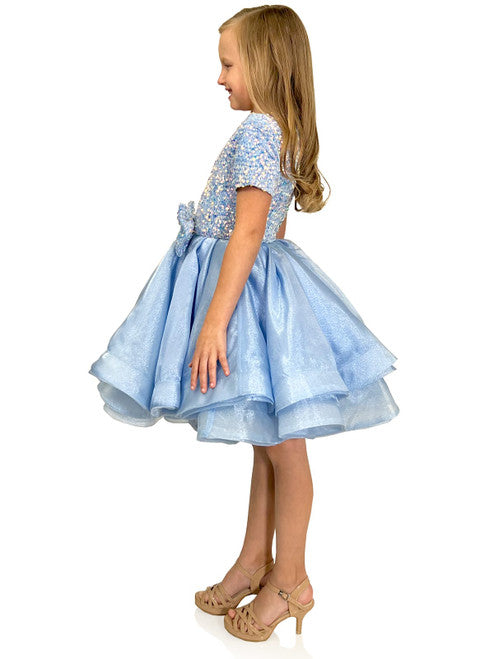 The Marc Defang 5105 Short Layered Organza Girls Dress Velvet Sequin Bow Pageant Wear is perfect for dressy occasions. Made of high-quality organza and featuring a soft velvet bodice and a sparkling sequin bow, it offers a stylish and comfortable look for your little one. With multiple layers of tulle and a lightweight fit, she'll be sure to make a statement at any event. Baby