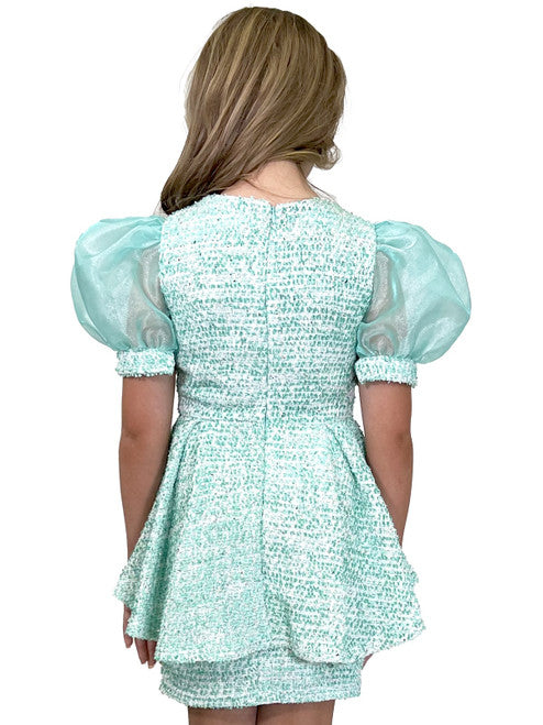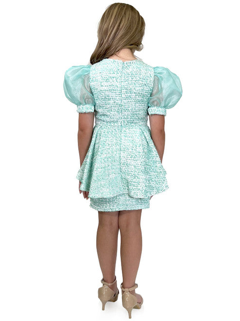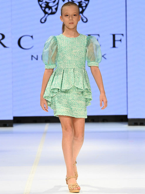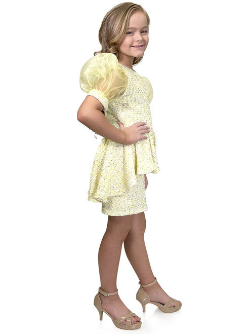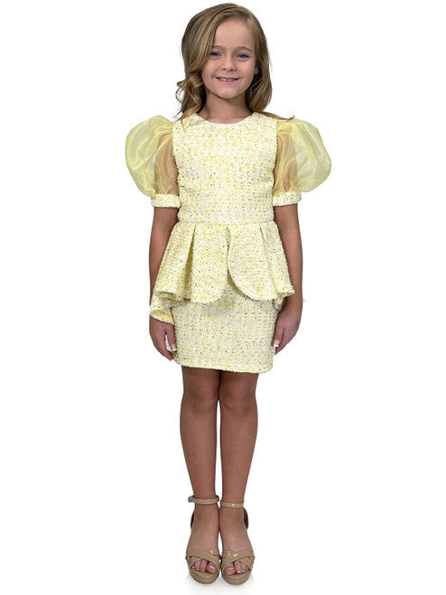 Marc Defang 5141 Girls Short Tweed Puff Sleeve Interview Formal Dress Ruffle Pageant Wear