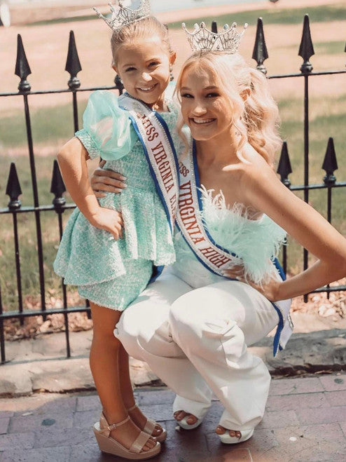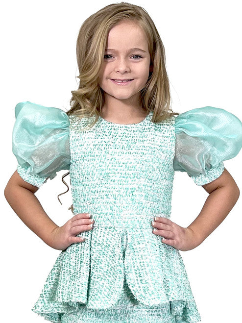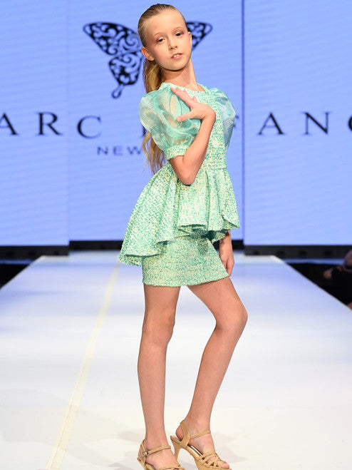 Marc Defang's 5141 short tweed dress offers a stylish and professional look for your daughter's special occasions. This formal dress features and eye-catching puff sleeves and a playful ruffle skirt, while the tweed fabric ensures durability. Perfect for a pageant or an interview, this dress is sure to make a memorable impression.