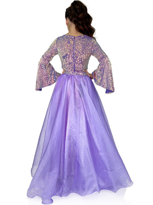 Marc Defang 8004k Kids Size 6 Iridescent Purple Jumpsuit Sequin Bell Sleeve Pageant Overskirt Fun Fashion