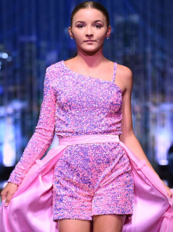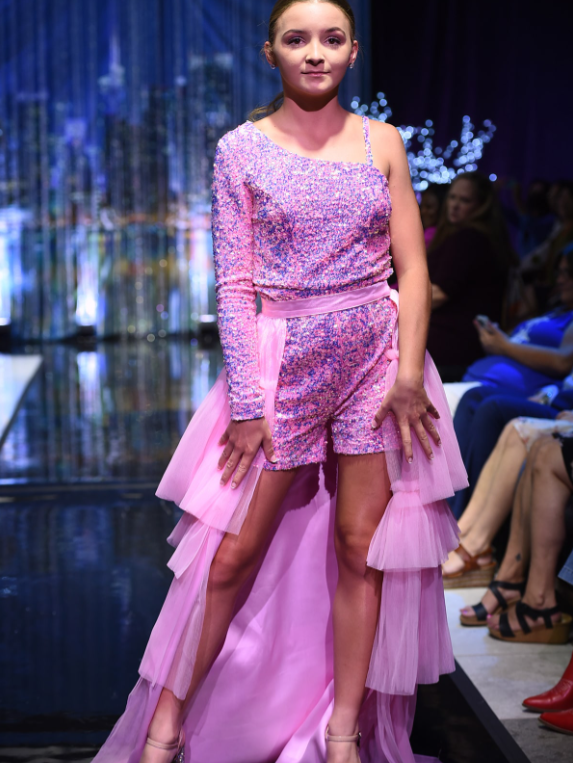 Marc Defang 8048K Girls Pageant Romper Velvet Sequined One Shoulder Long Sleeve Fun Fashion