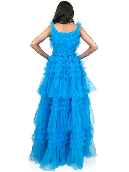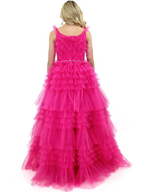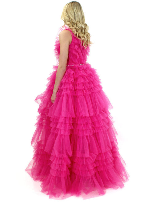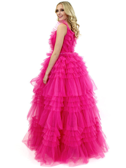 The Marc Defang 8092 Prom Dress is perfect for any ballroom. With its V neckline, long tulle layered ruffles, and sparkling crystal detail, it is sure to make you the center of attention. Its comfortable fit and luxe fabric makes it the ideal choice for a special occasion.
