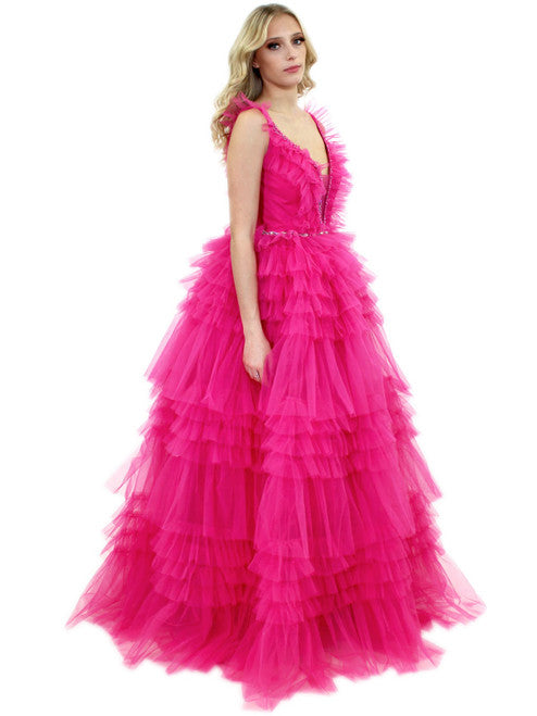 Marc Defang 8092 Long Layer Ruffle V Neck Prom Dress Pageant Ball Gown Crystal V Neck Tulle