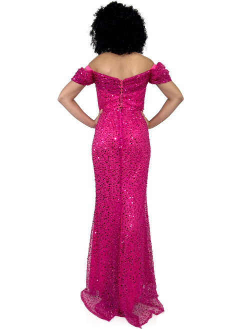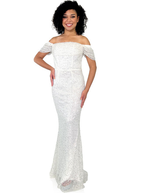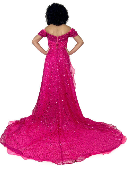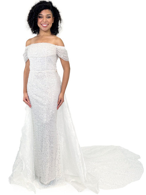 This Marc Defang 8228 dress is an elegant, fitted off-the-shoulder design, featuring a detachable overskirt and ornate pearl, sequin, and beaded detailing. It's perfect for a unique prom, pageant, or wedding look. Corset back
