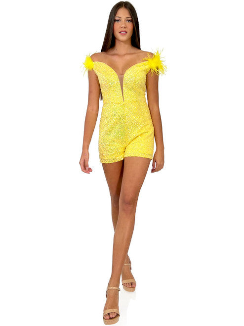 The Marc Defang 8252 Short Sequin Pageant Romper is an off-the-shoulder dress with a fun, fashionable style. It features an iridescent sequin design, ostrich feathers on the shoulder, a v-neck cut and an invisible zipper closure in the back. This form-flattering Romper is fully lined and comes in a variety of colors and sizes.