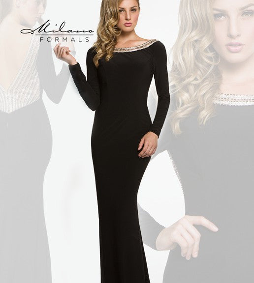 Milano Formals E 1859 Long Sleeve fitted backless Gown trimmed with beaded embellishments. This scoop neck evening gown features a sheer beaded drop back. Long Gown with a sweeping train. The ultimate classic look for any Formal event!