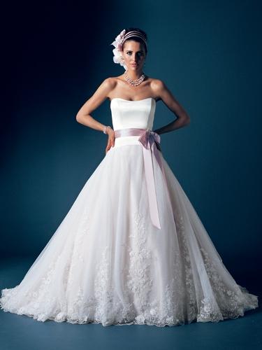 Mon Cheri Couture ST1730S is a gorgeous satin strapless bodice with a blush bow & sash along the waist with a crystal broach. Lush Princess style tulle ballgown skirt with an elaborate lace edge scallop trim. embellished floral lace appliques put this dress over the top. Bustle built in or let down for a lush lace & beaded train. This gown is so Lush!
