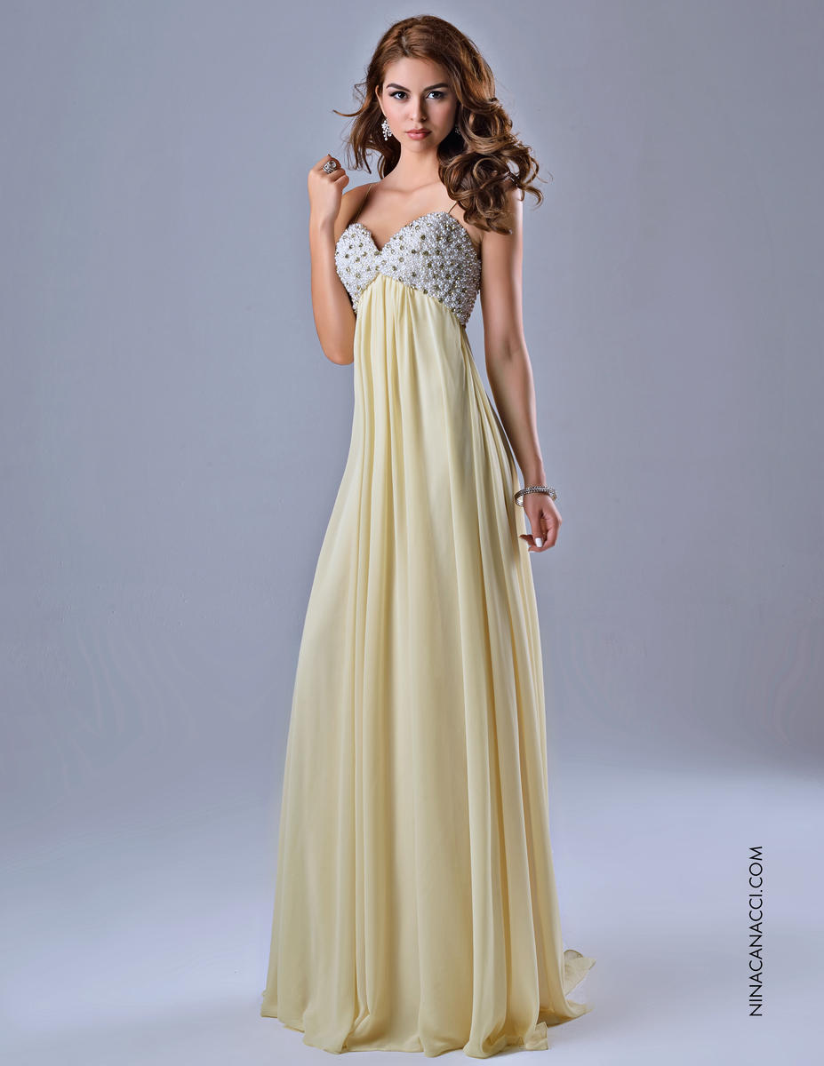 Nina Canacci 1095 is a flowing chiffon babydoll formal prom dress. Featuring a Heavily embellished & Pearl accented bodice with spaghetti straps. cutout back with embellished back strap. Stunning pastel colors. sweeping train