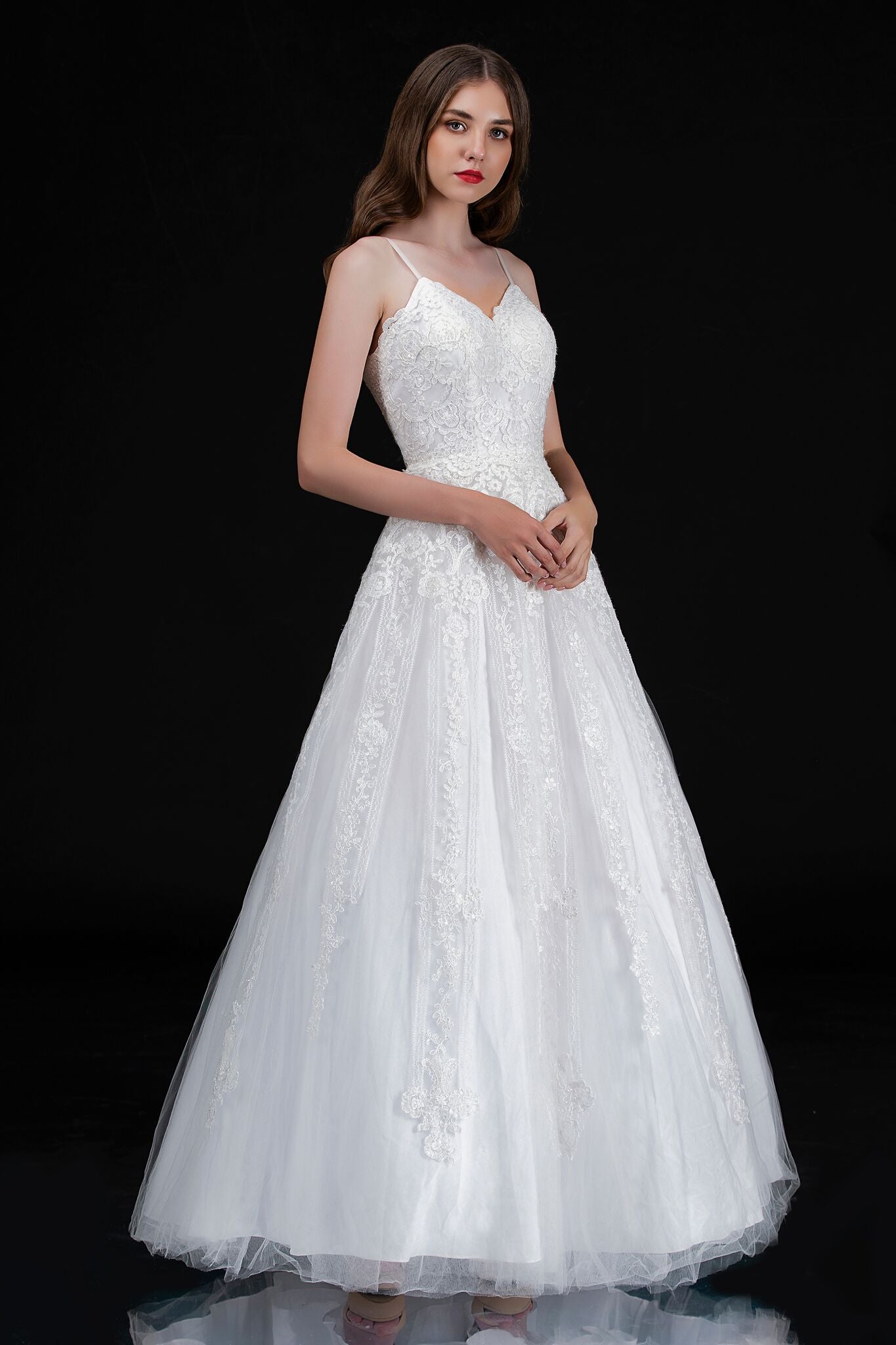 Nina Canacci 1508 is a long Lace Embellished Ivory wedding Dress. Featuring a scallop edge lace fitted bodice with adjustable spaghetti straps. Cascading floral embroidered lace flowing into the full a line ballgown skirt. Great Plus Size Bridal & Destination wedding dress. Sequin Embellished A Line Ballgown.