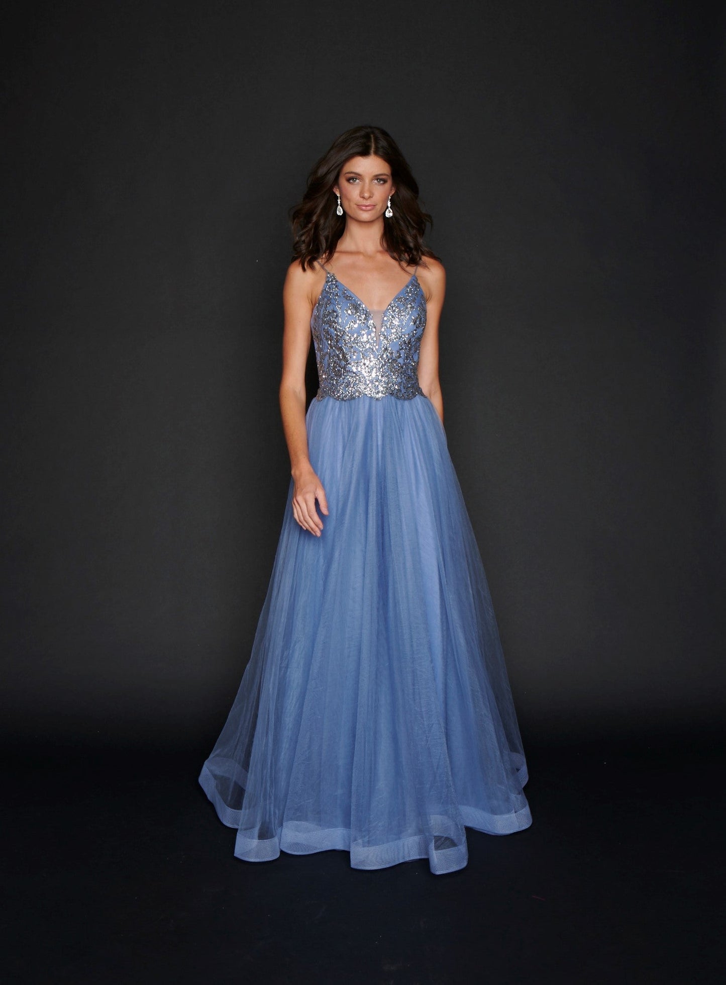 Nina Canacci 1522 Size 10 Steel Blue Long A Line Glitter Prom Dress Formal Party Gown V Neck