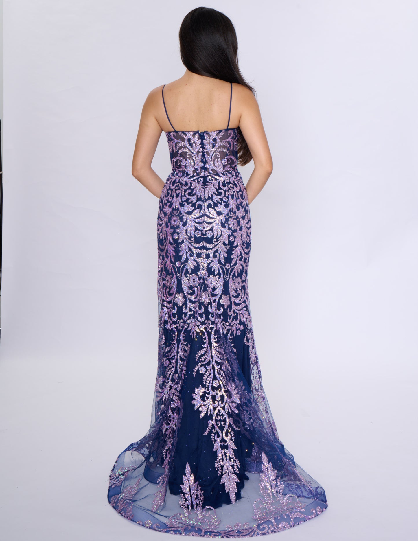 Nina Canacci 1575 Navy/Lilac Fit and Flair Prom Dress V Neckline Spaghetti Straps