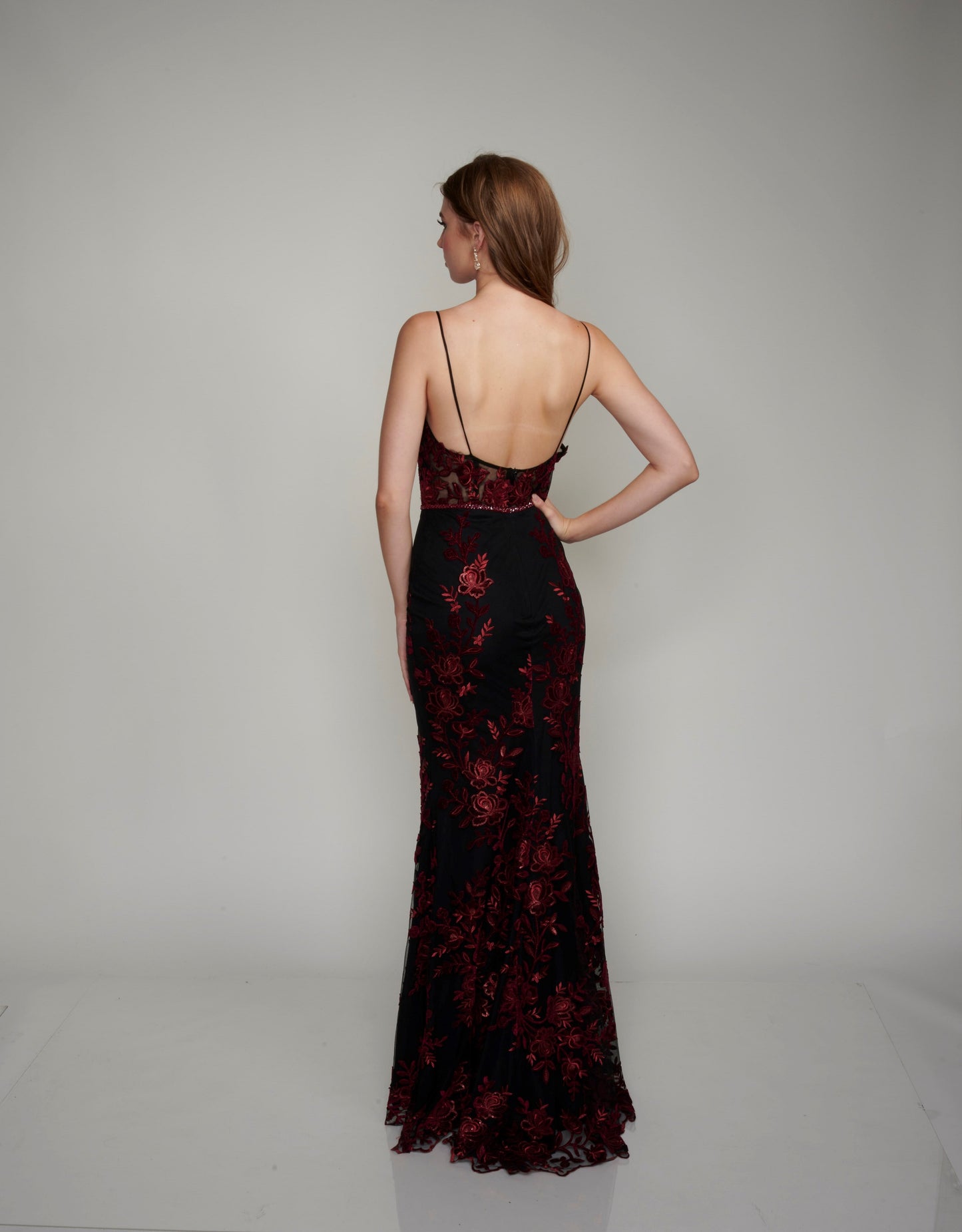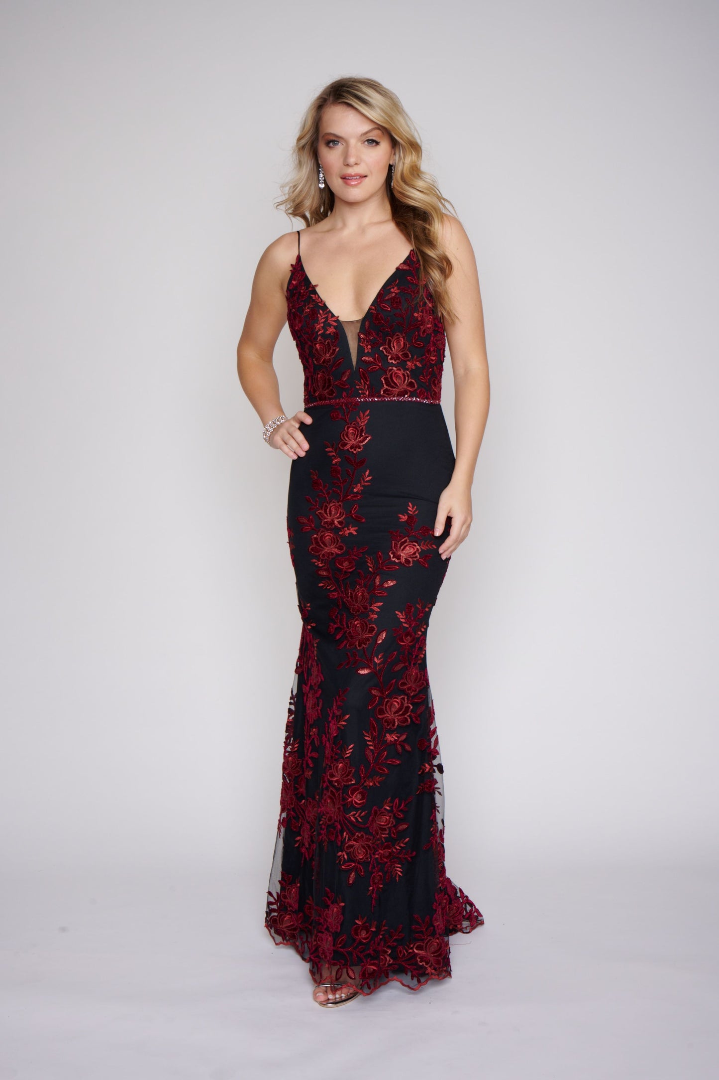 Nina Canacci 2240 Black Burgundy Long Prom Dress Fitted Evening Gown Floral Lace Dress This dress has a v neckline with sheer courtesy panel and a sheer lace back. It is fully appliqued with Burgundy lace. The fit and flare design is gorgeous on you and it has a matching embellished belt.