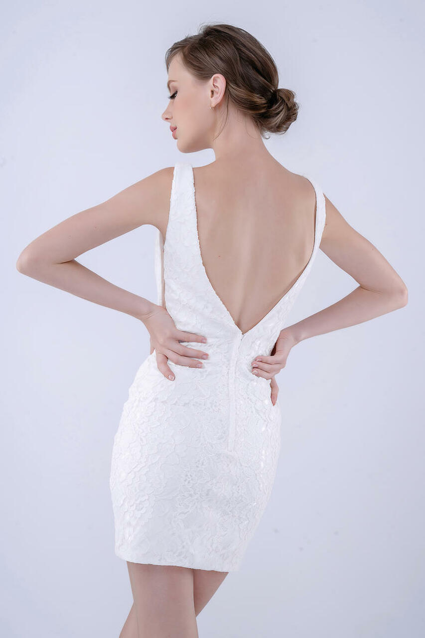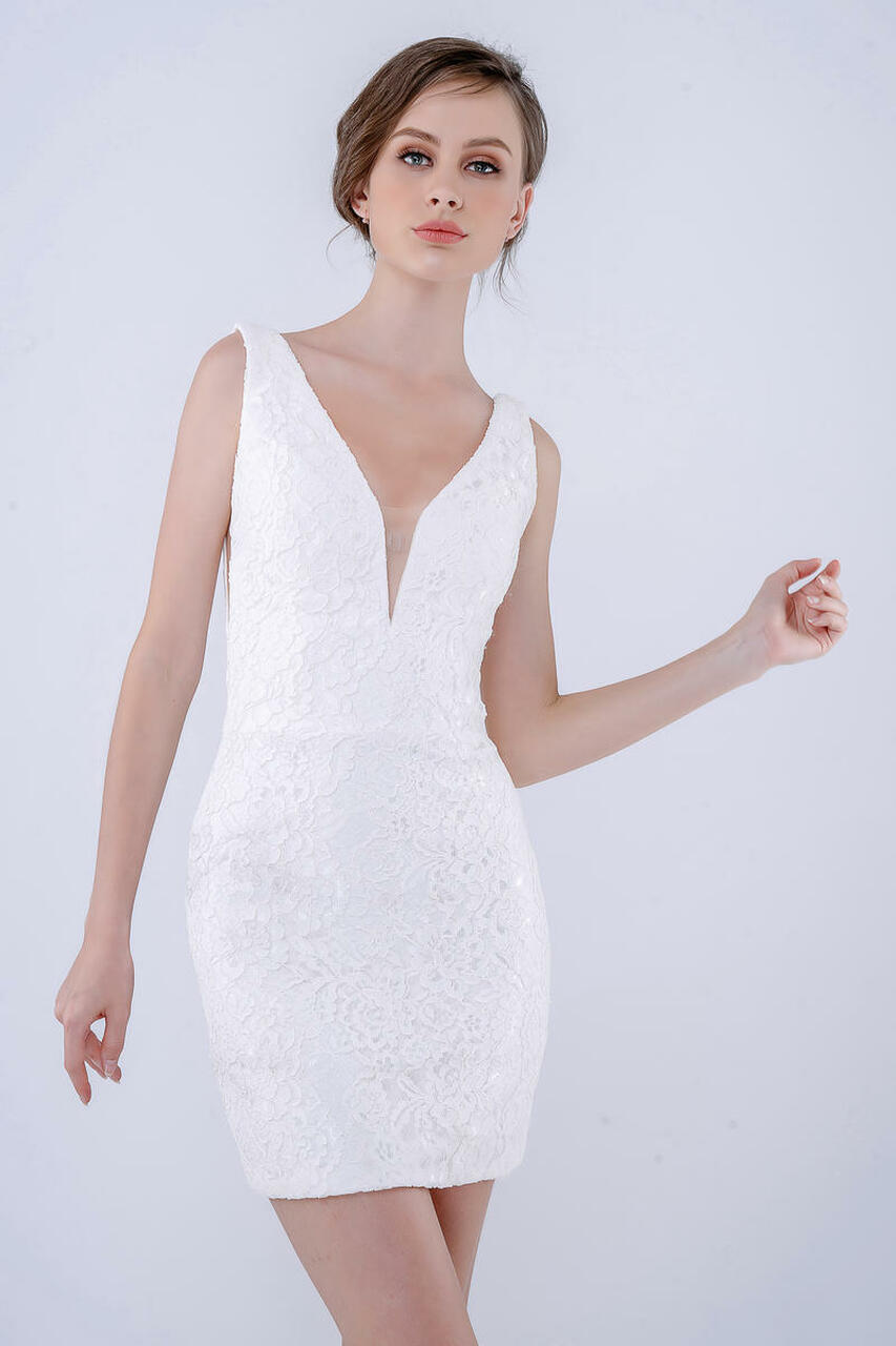 Nina Canacci 266 is a short fitted formal lace cocktail dress. Featuring a V neckline and sheer mesh side panel sides. This simple & Elegant style is perfect for any formal or semi formal event! Open V back.