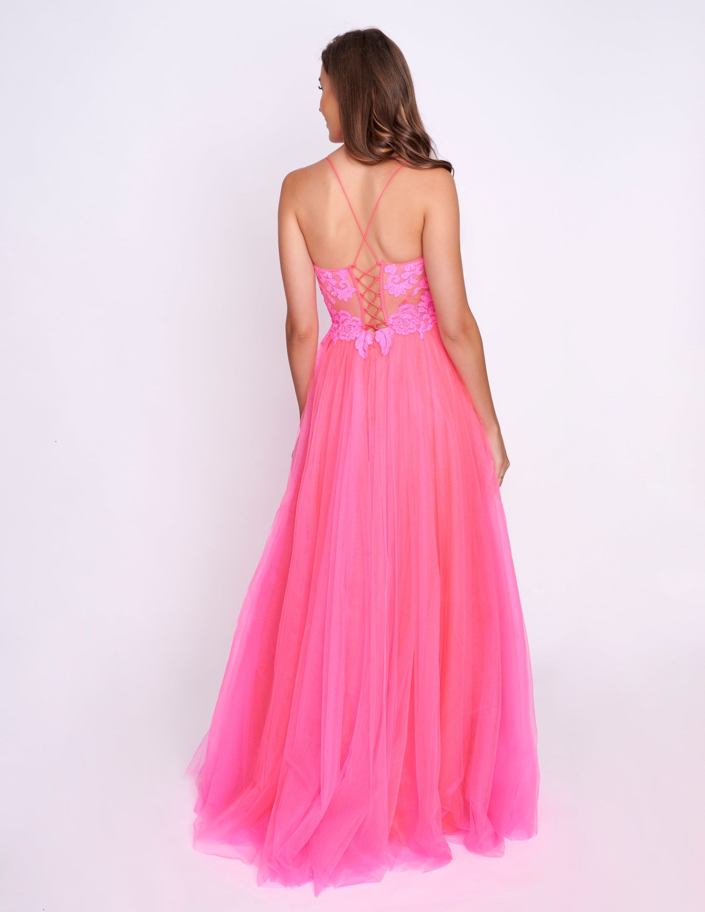 Elevate your formal look with the Nina Canacci 4421 Long Sheer Lace A Line Prom Dress. This stunning gown features sheer lace detailing and a corset bodice for a touch of drama. The A-line silhouette flatters every figure, while the slit adds a sensual touch. Perfect for prom or any special occasion.