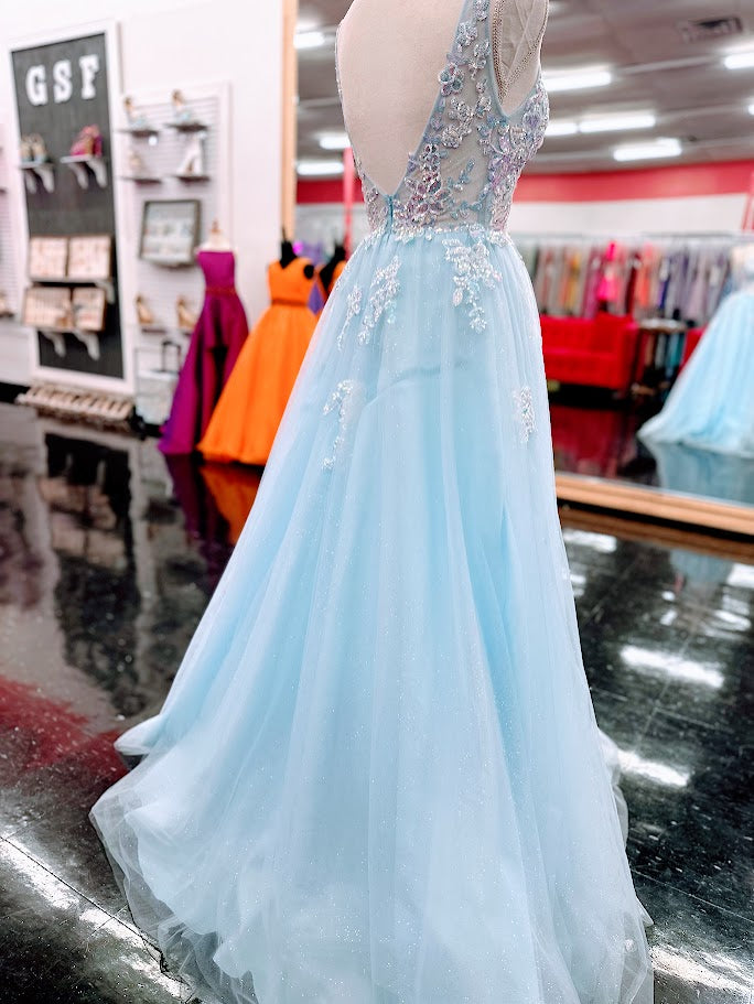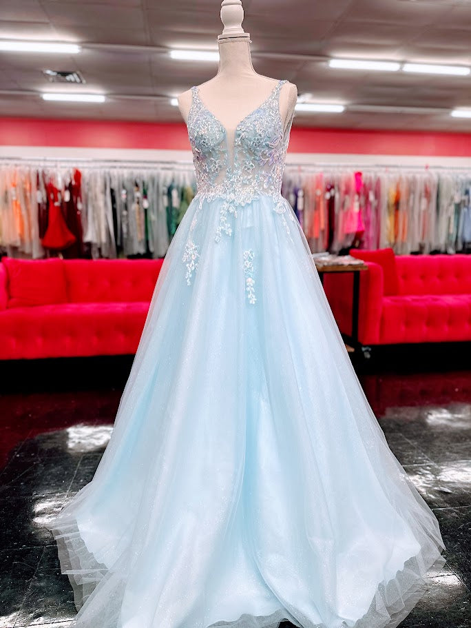 This Nina Canacci 4427 ballgown in size 4 showcases exquisite sequin lace detailing over a sheer bodice, creating a refined and elegant look. The flattering V-neckline and classic A-line silhouette enhance your figure while offering graceful movement. Perfect for prom or formal events, this gown combines timeless sophistication with subtle sparkle for a memorable evening.