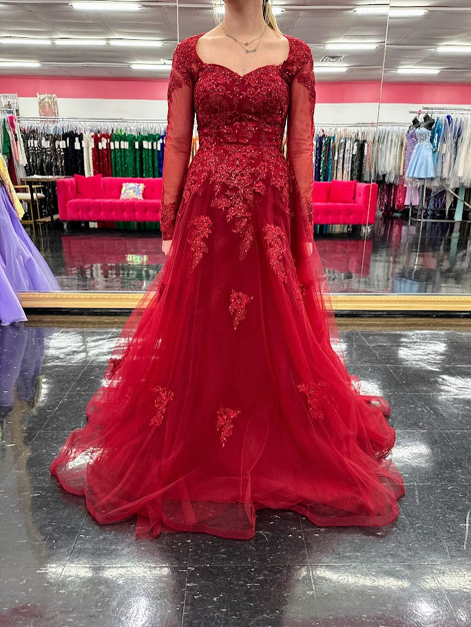 This elegant Nina Canacci 5310 dress in size 4 features a delicate rose lace design with long sleeves and a flattering A-line silhouette. Perfect for formal occasions, it showcases a high sheer lace back and a sweetheart neckline, combining classic sophistication with modern detail. Ideal for a mother of the bride or evening event, this gown offers timeless grace and refined style.