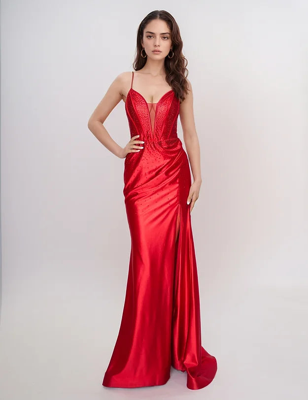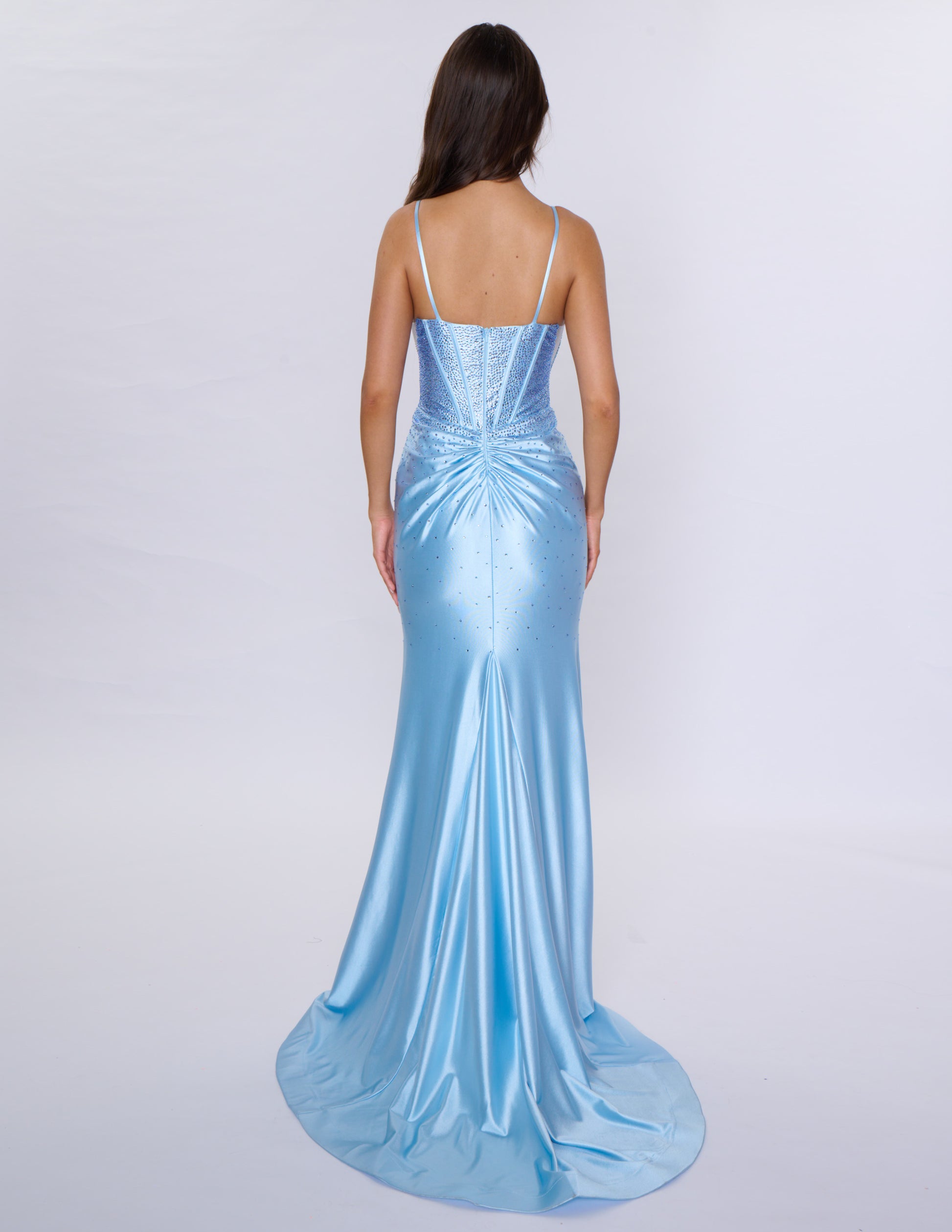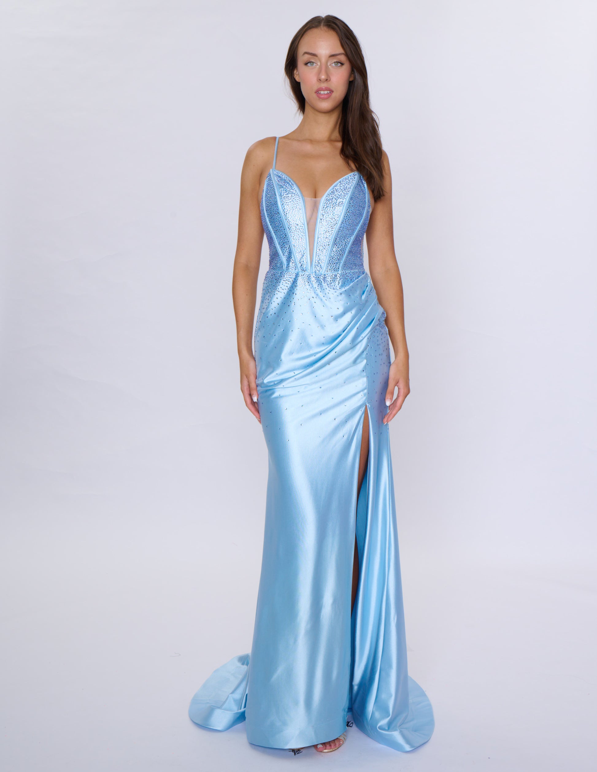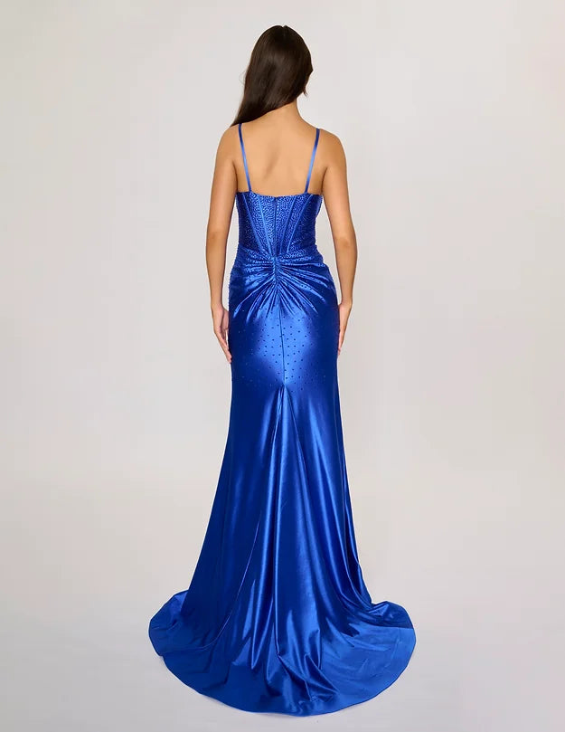 Experience elegance and glamour with our Nina Canacci 6687 long fitted prom dress. Featuring a crystal corset and a V-neck with a tasteful slit, this dress is perfect for formal evening events. Its figure-hugging fit and intricate details will make you stand out and feel confident all night long.
