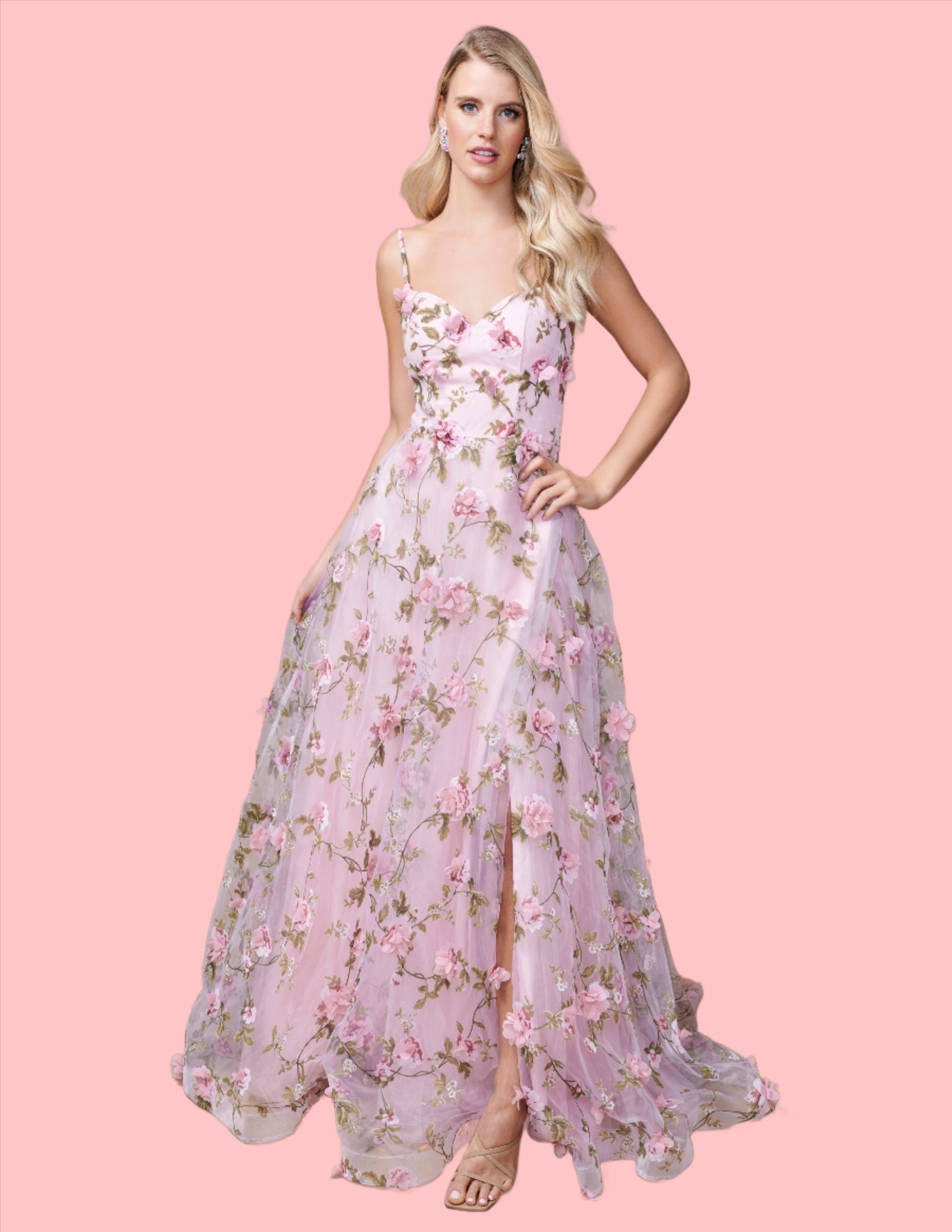 Nina Canacci 9150 Size 0, 4 Pink A Line Floral Maxi Slit Prom Dress 3D Formal Gown Print V Neck Evening
